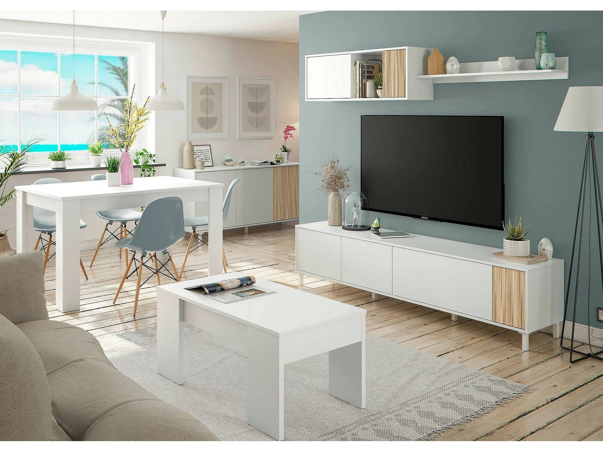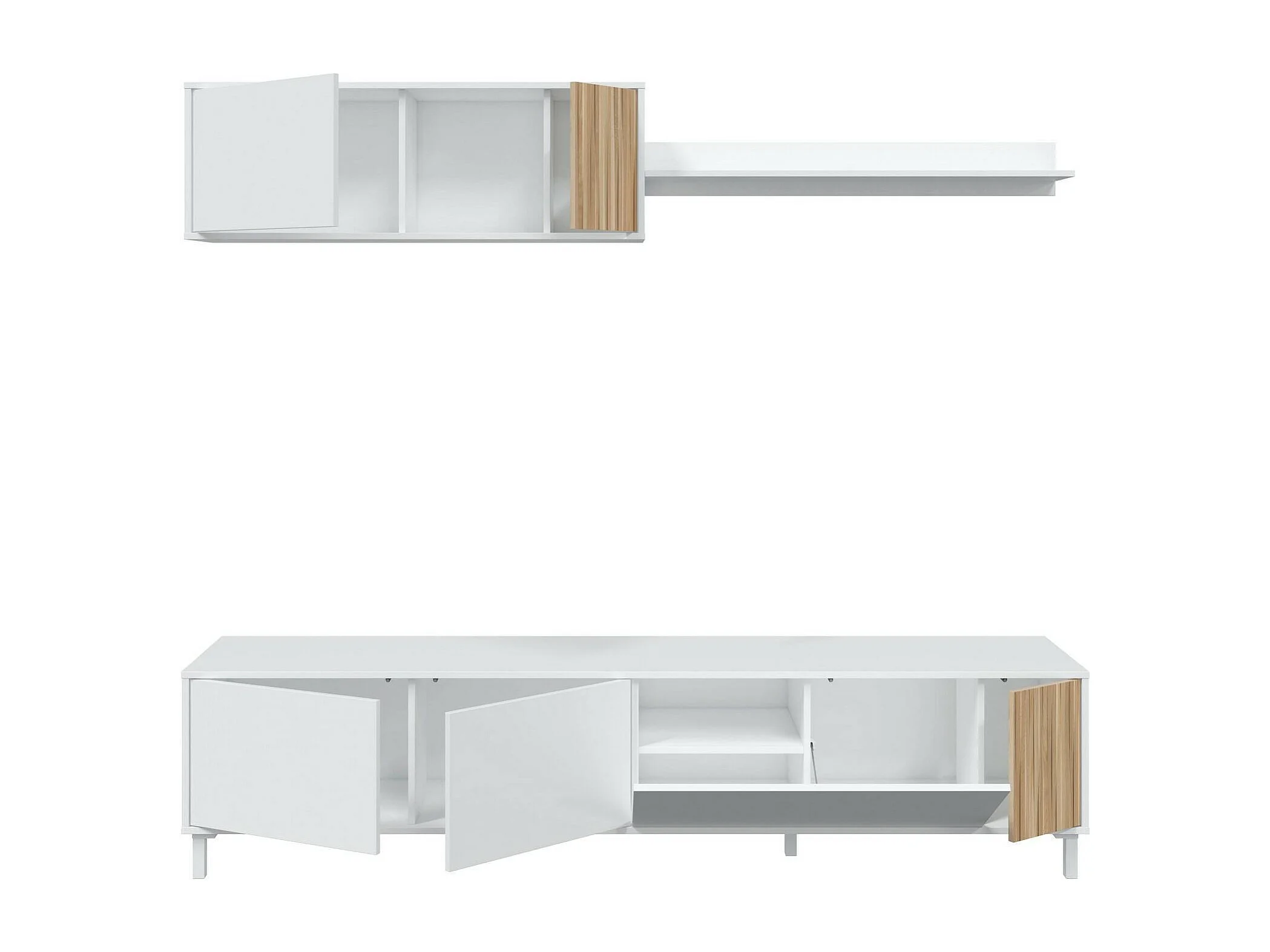 Dolze wandsysteem, Woonkamerkast met deuren, Hangkast met plank, Multifunctioneel dressoir, 200x40h47 cm, Wit en Eiken