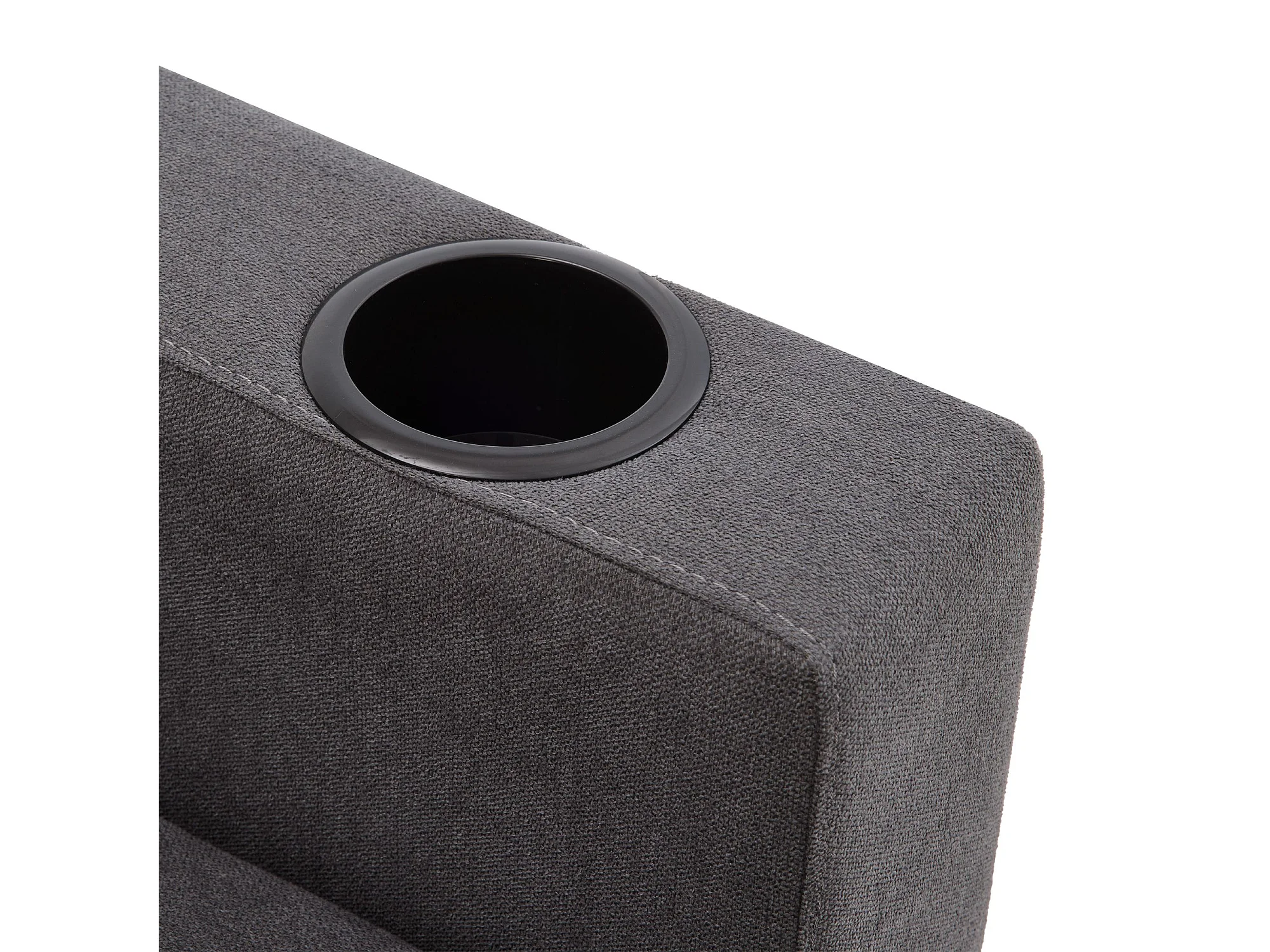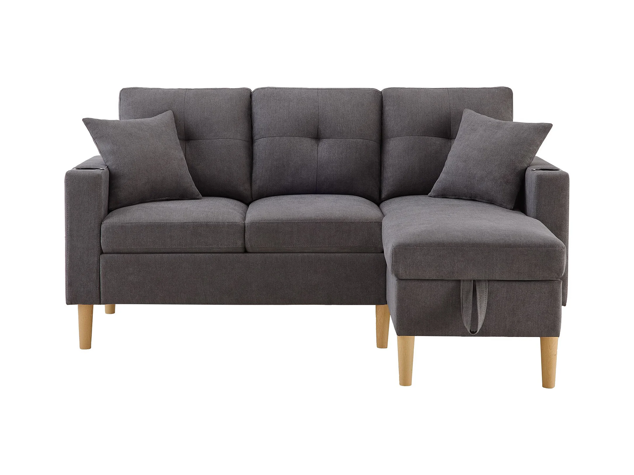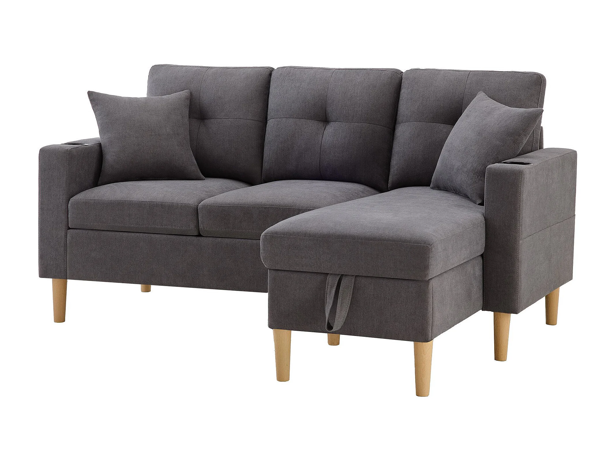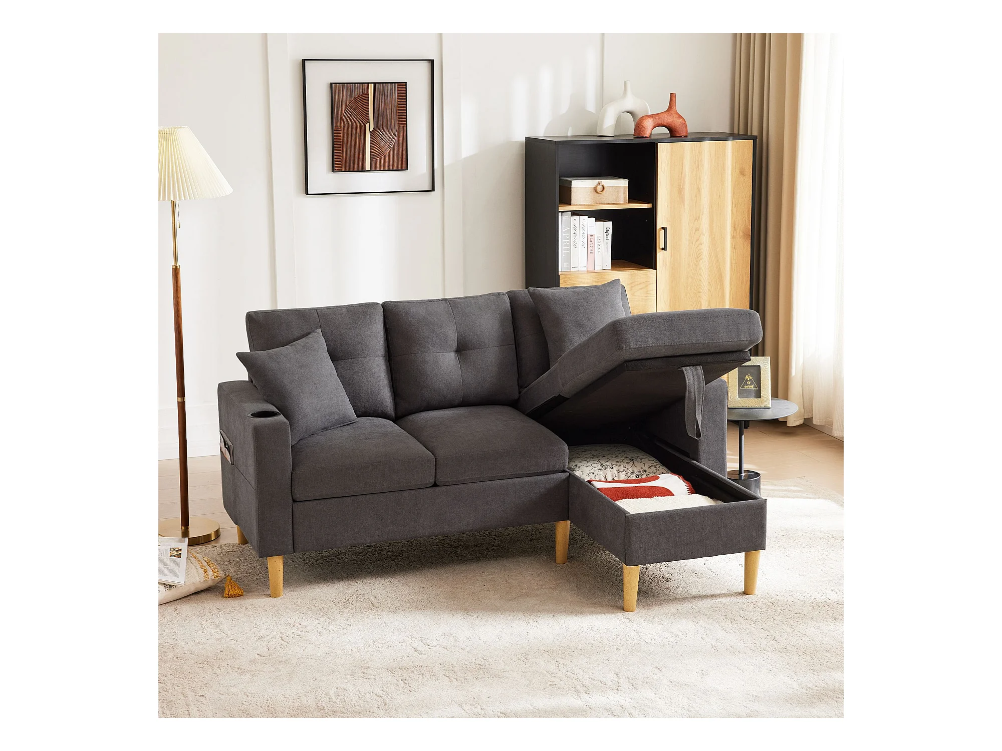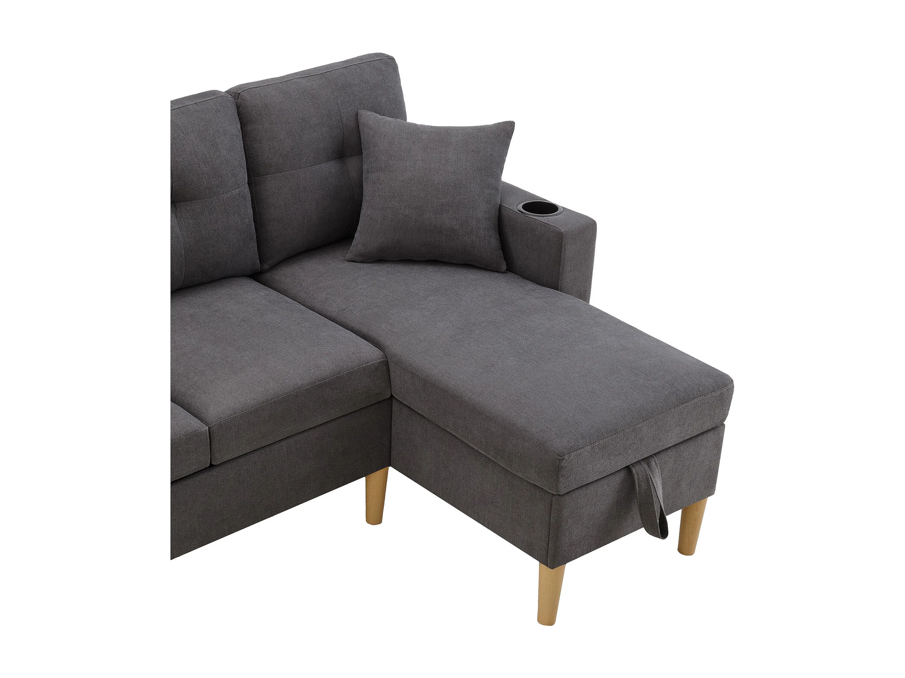 Donkergrijze 3-zitsbank - Hoekbank met 2 kussens en bekerhouder - zijvakken en opbergruimte - katoen en linnen