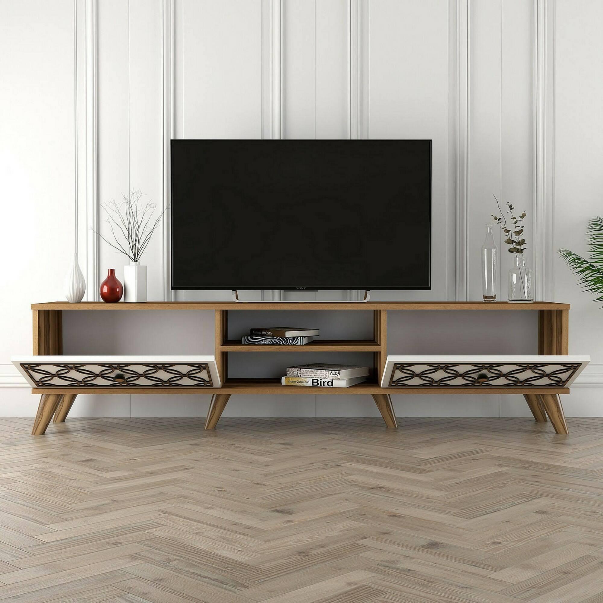 Dleonard tv-meubel, CreWoonkamer, Lage tv-meubel, Uitgeruste wandvoet, 180x35h49 cm, Wit en Walnoot