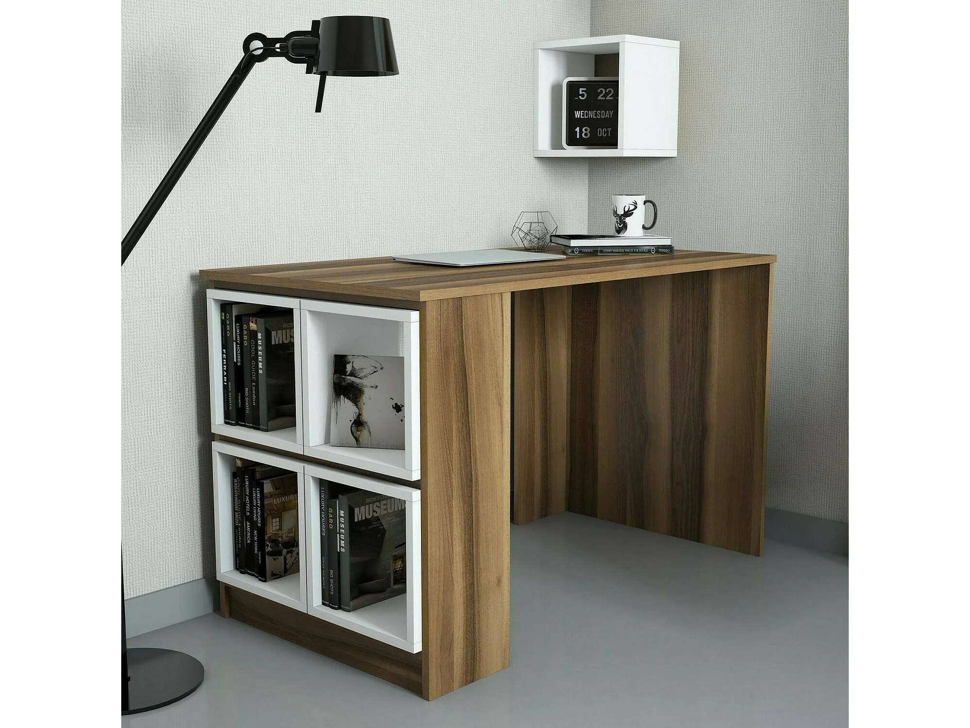 Dpin Bureau, Multifunctioneel Bureau, PC Kantoortafel, Werkblad, 120x65h75 cm, Walnoot en Wit