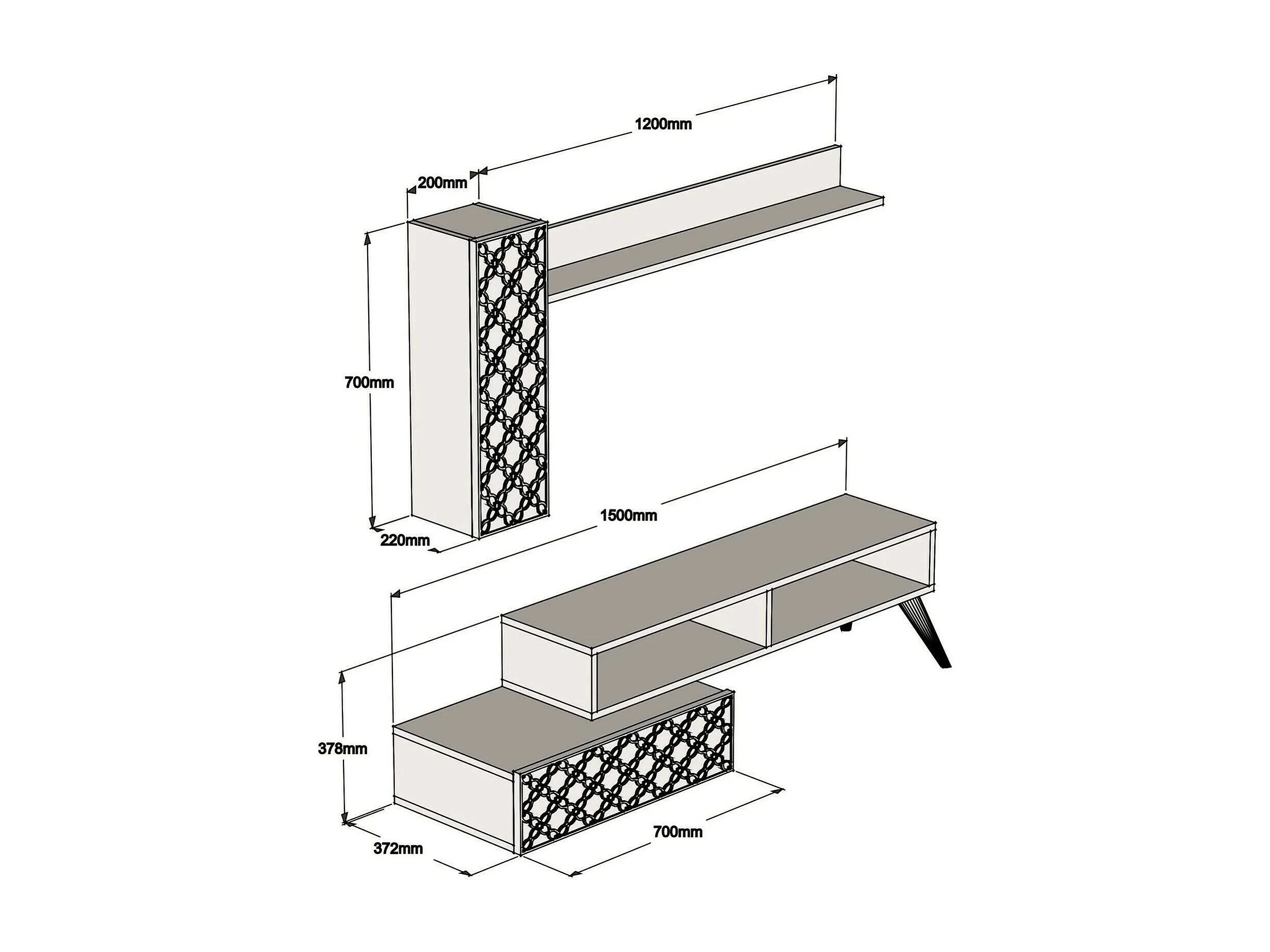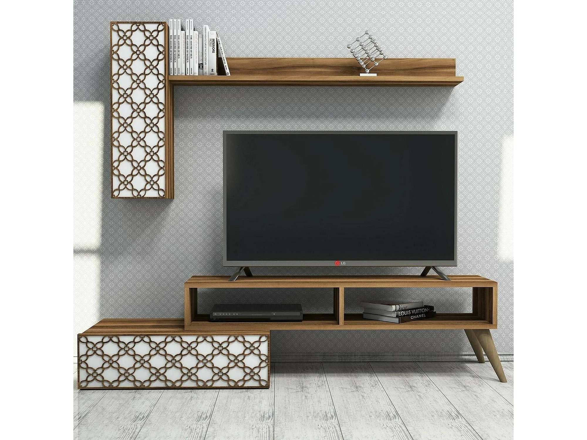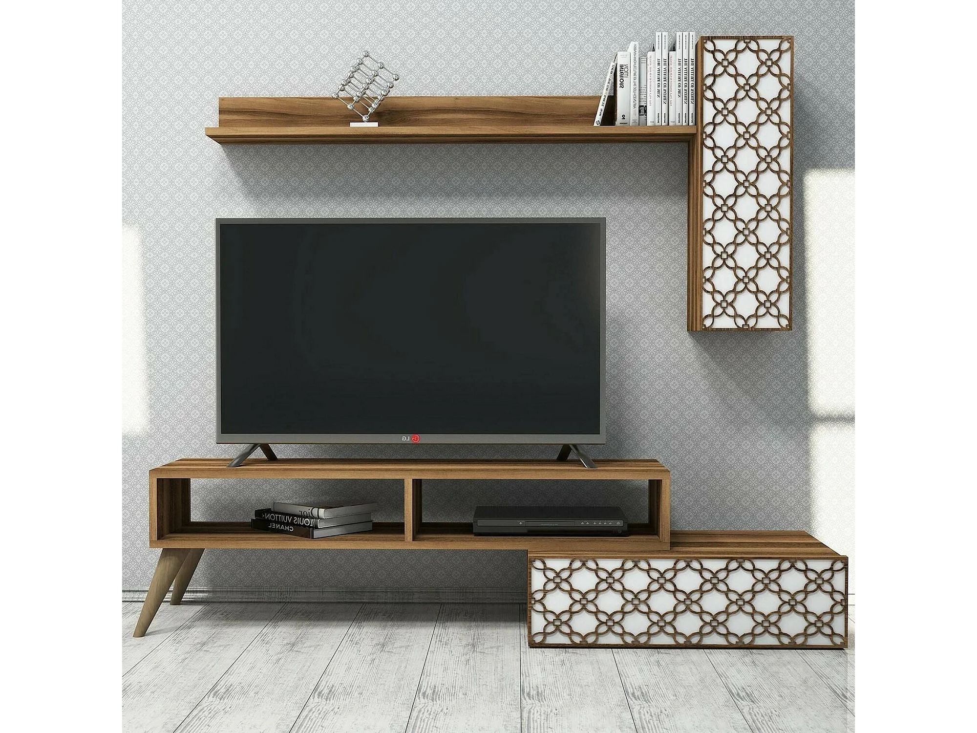 Dpinard-wand, woonkamer, multifunctionele woonkamermeubel, tv-meubel, 150x37h38 cm, walnoot en wit