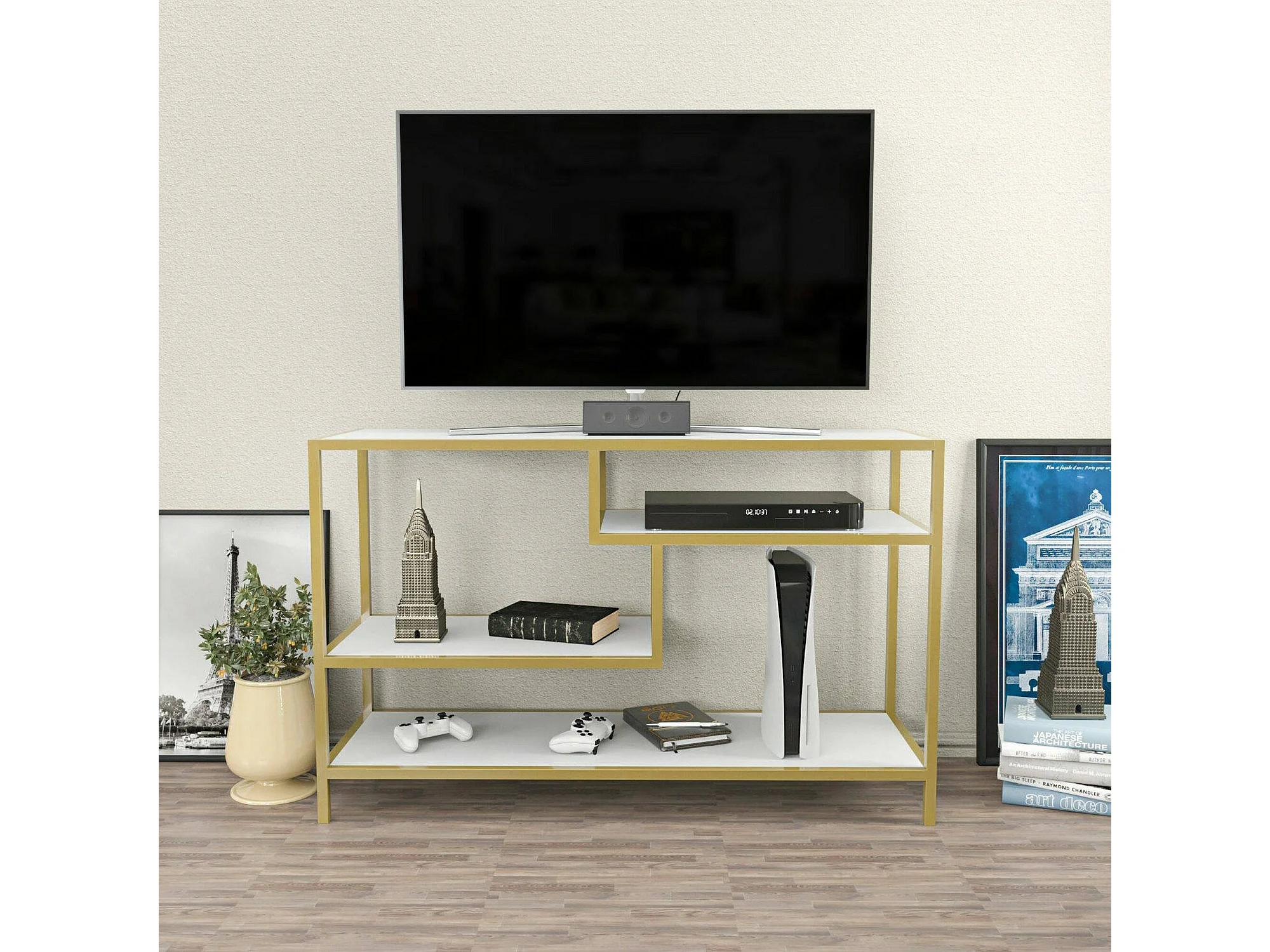 Dplizzar tv-houder, bijzet voor in de woonkamer, kastTv-bas, wandvoet, 120x39h75 cm, goud en wit
