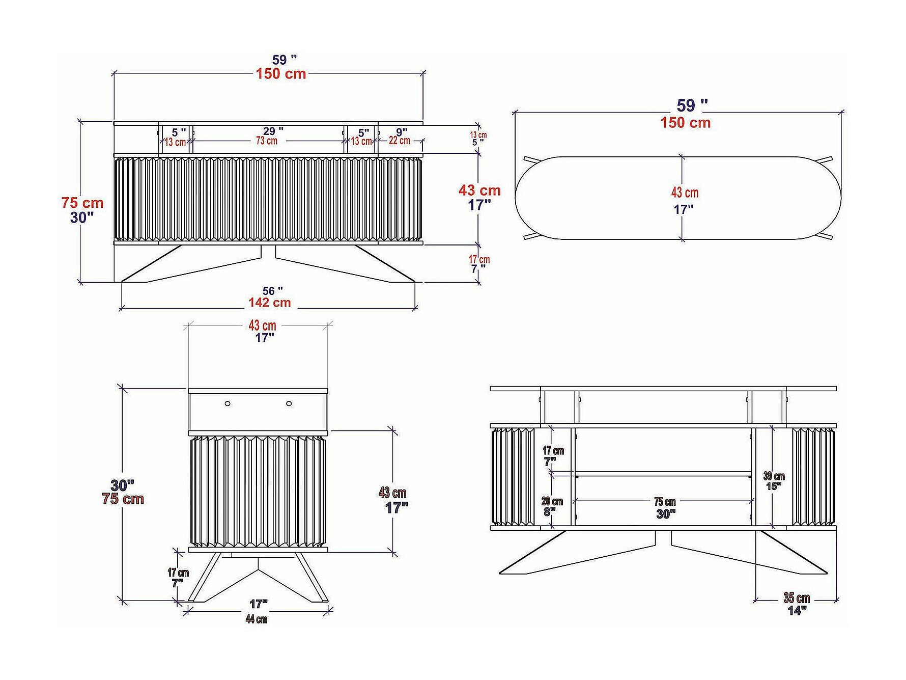 Dpoluzz dressoir, buffet, woonkamer, keukenkast, 150x43h75 cm, eiken en wit