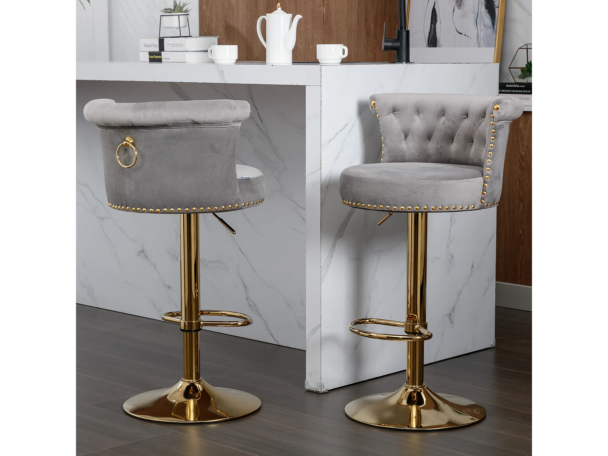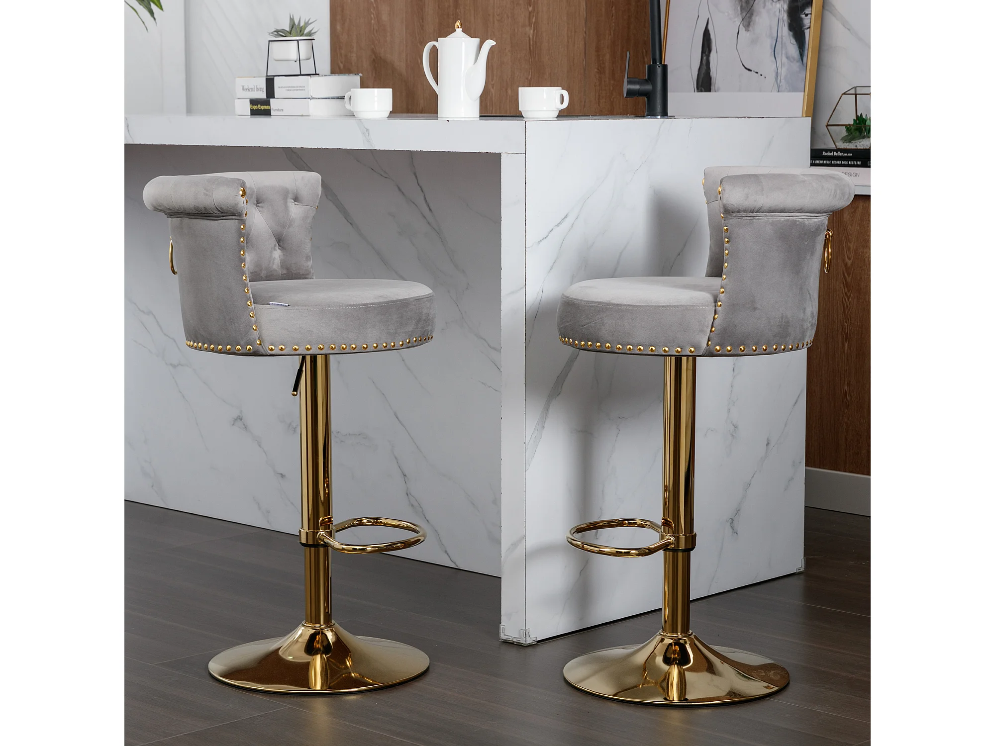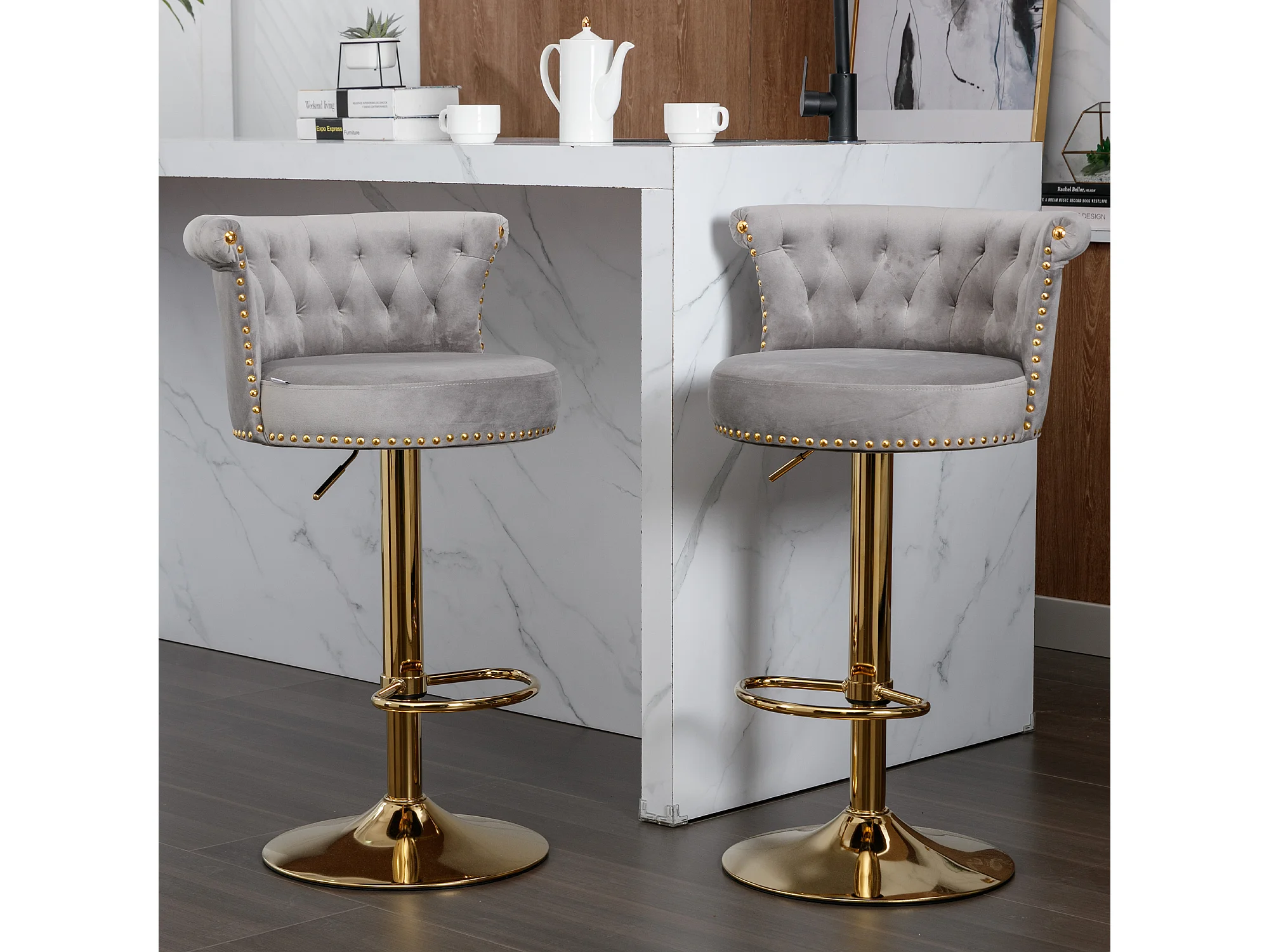 Draaibare barkrukken, verstelbare barstoelen, met voetenbank voor keuken/eetkamer, grijs, 2-delige set