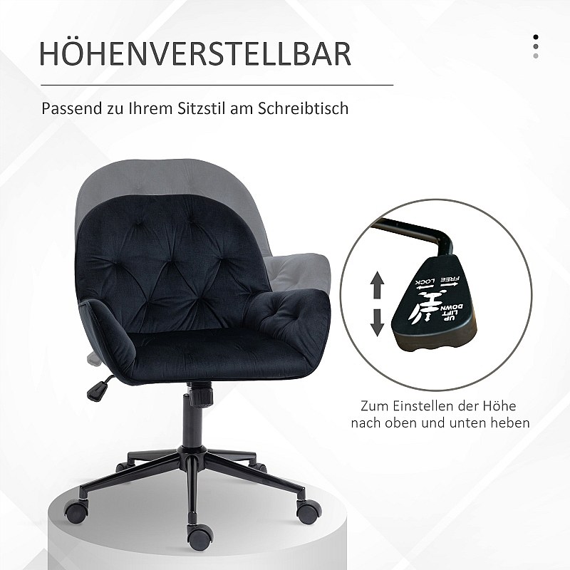 Draaibare bureaustoel, in hoogte verstelbare directiestoel, zitting bekleed met zwart fluweel en polyester, afmetingen 60x61x81-91 cm