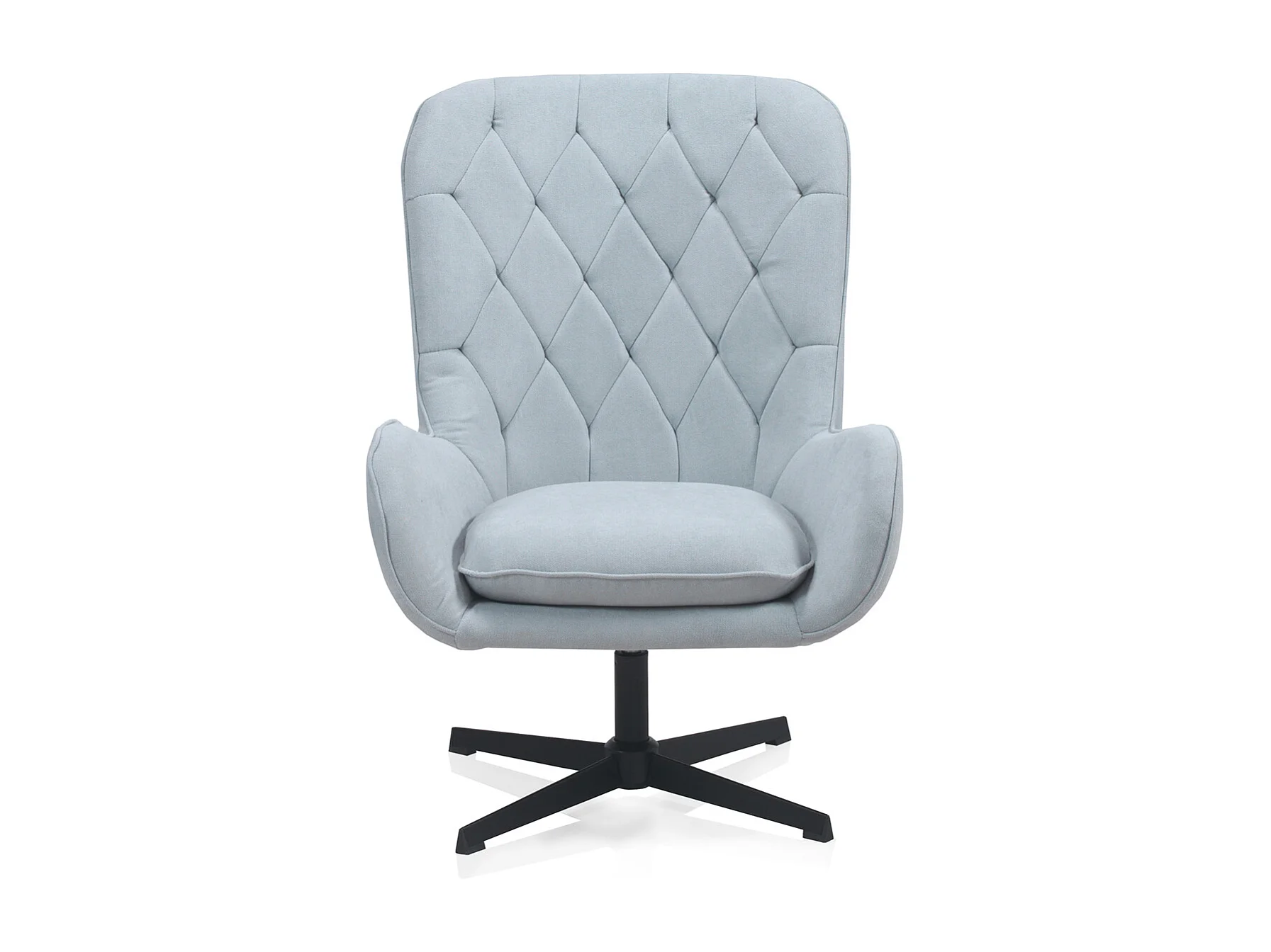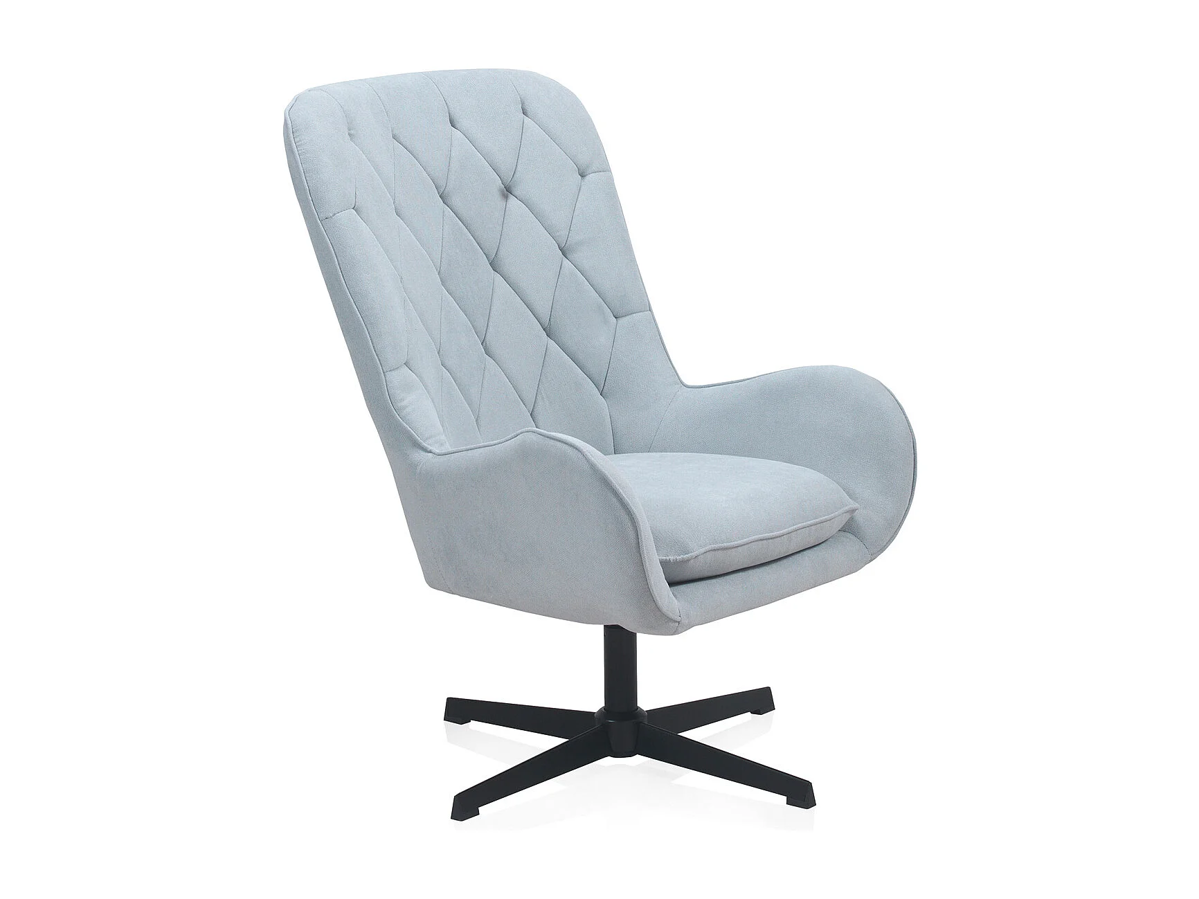 Draaifauteuil met lichtblauwe bekleding en metalen poten