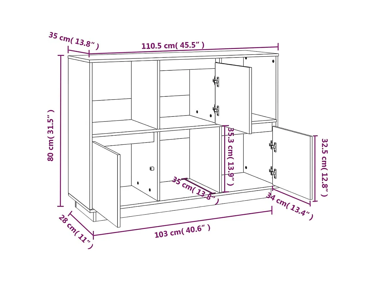Dressoir 104,5x34x80 cm massief grenenhout wit
