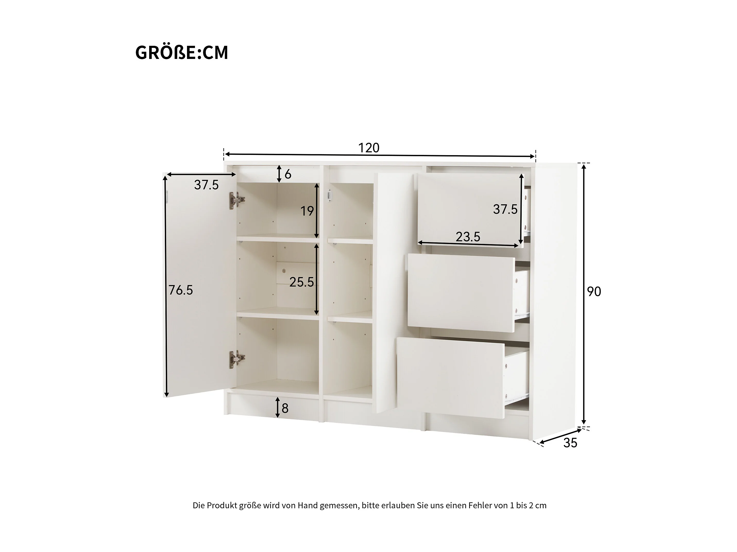 Dressoir 120x35x90 cm met lades en verstelbare planken, spaanplaat in wit, voor woonkamer