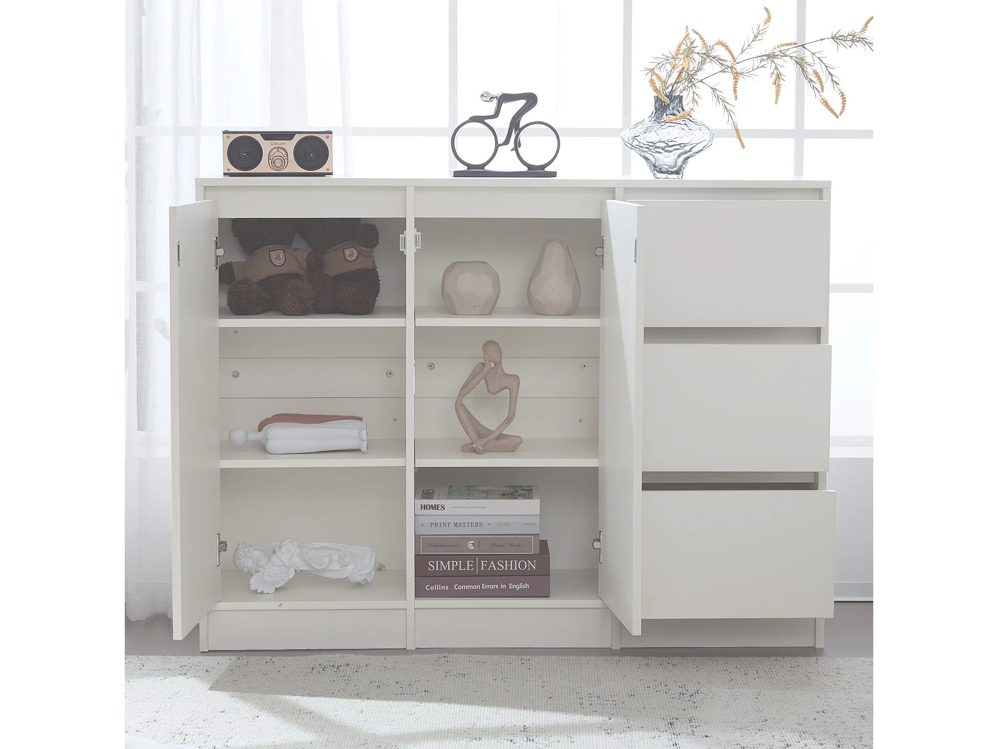 Witte hoge dressoir met 3 deuren - Dressoir met 2 lades en 6 open opbergvakken - 3 in hoogte verstelbaar