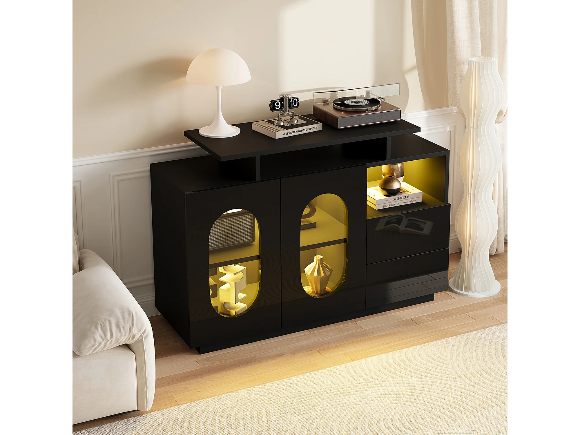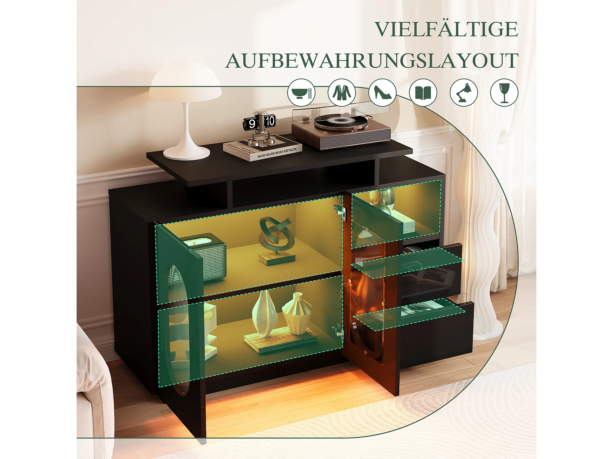 Dressoir, geïntegreerde ledverlichting, ovale glazen deuren, bewerkt hout, zwart (120x40x80cm)