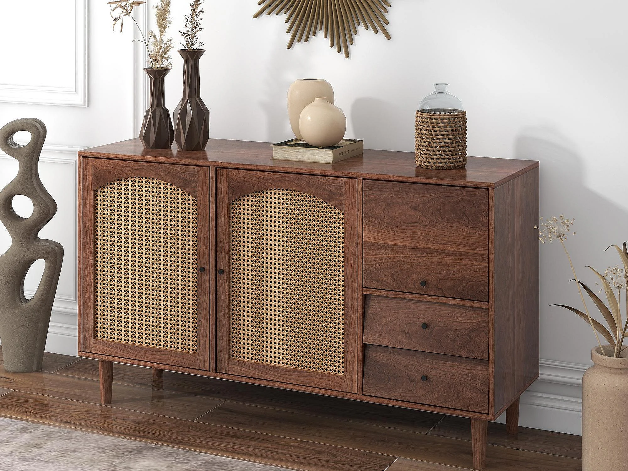 Dressoir met 3 deuren en 2 lades in spaanplaat - rotan effect - bruine kleur