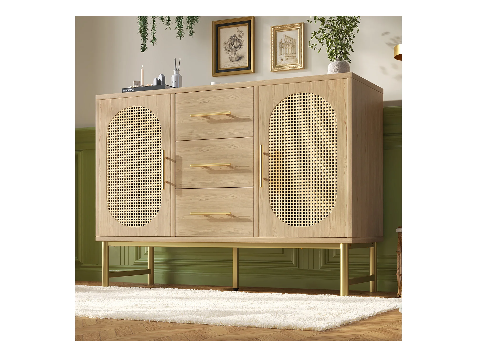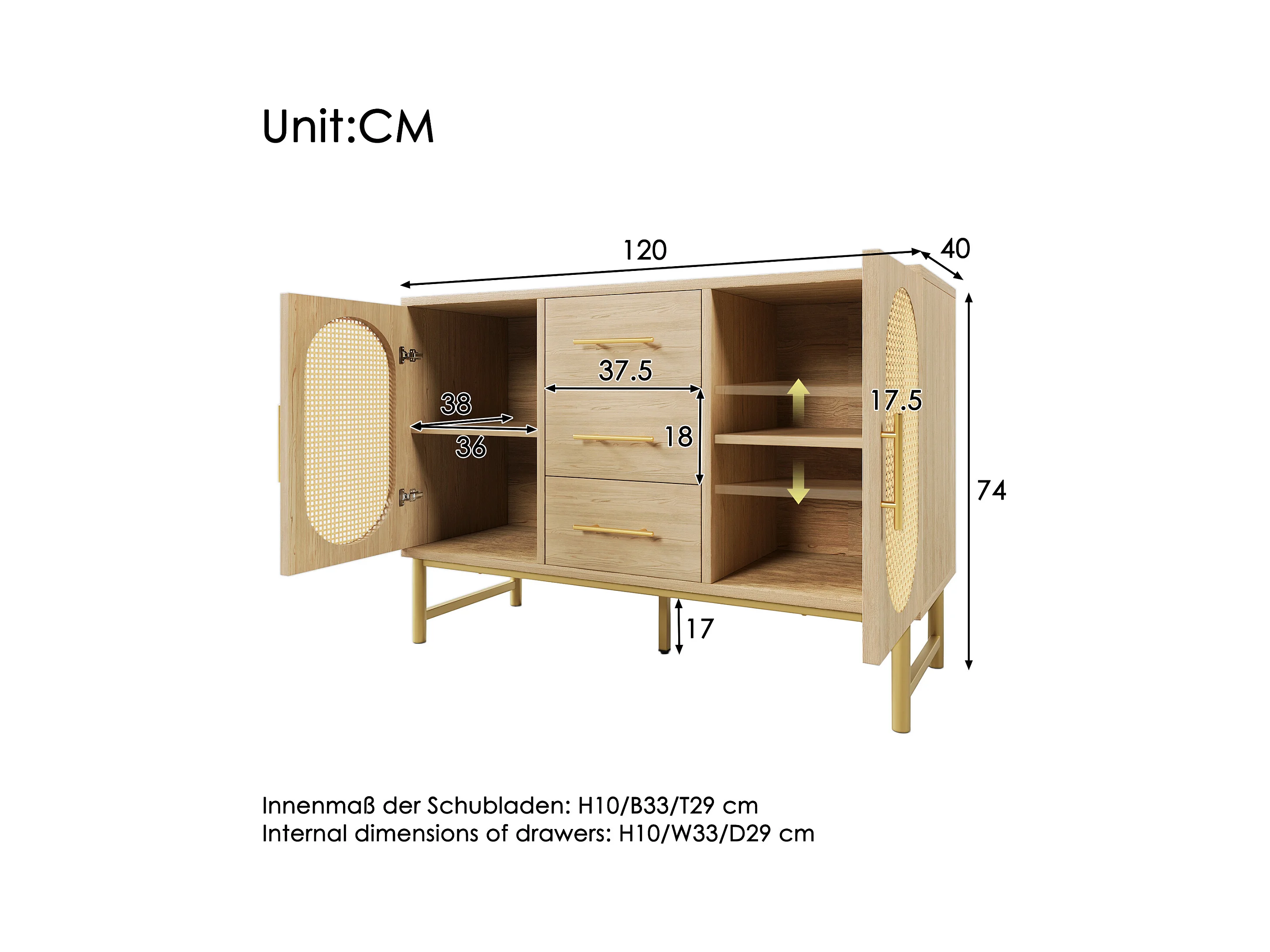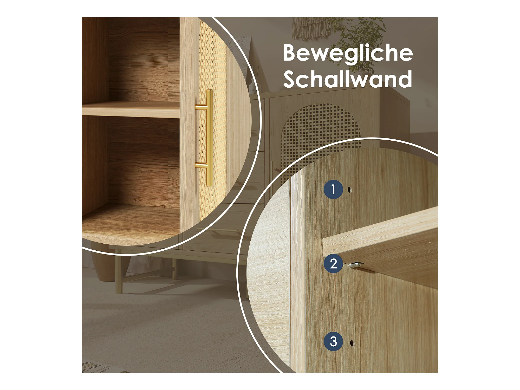 Dressoir met 3 laden en 2 rotan deuren - 120 x 40 x 74 cm - Verstelbare planken - Spaanplaat - Eiken