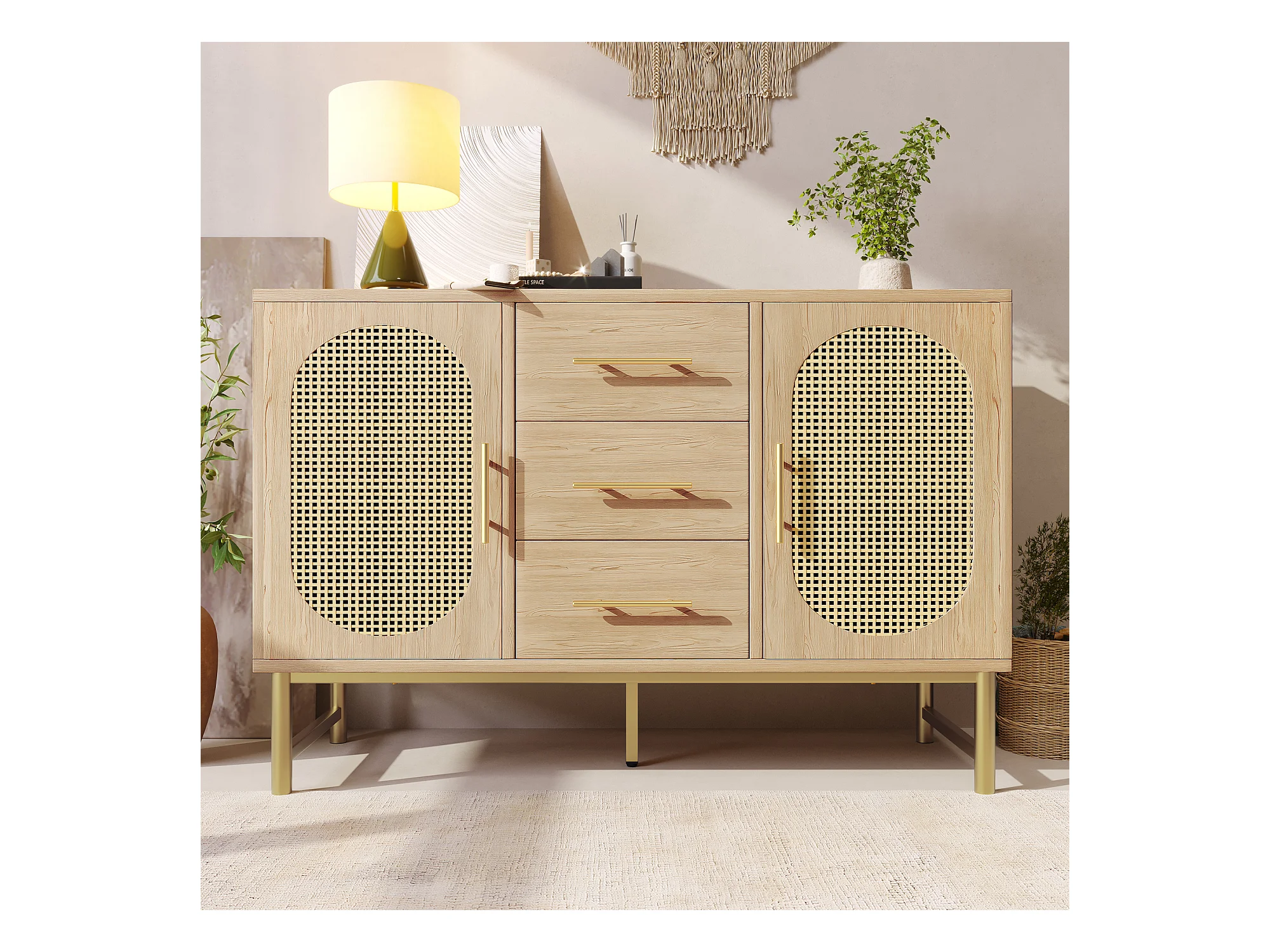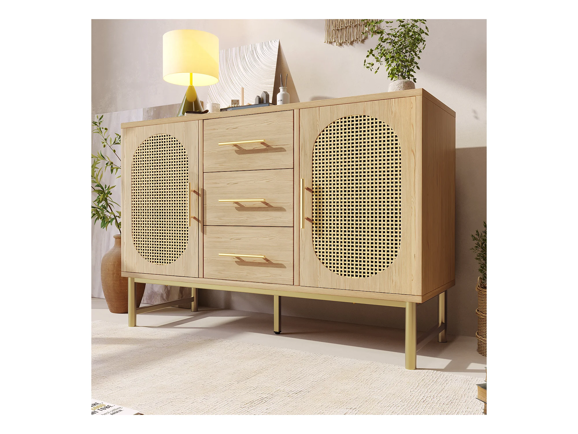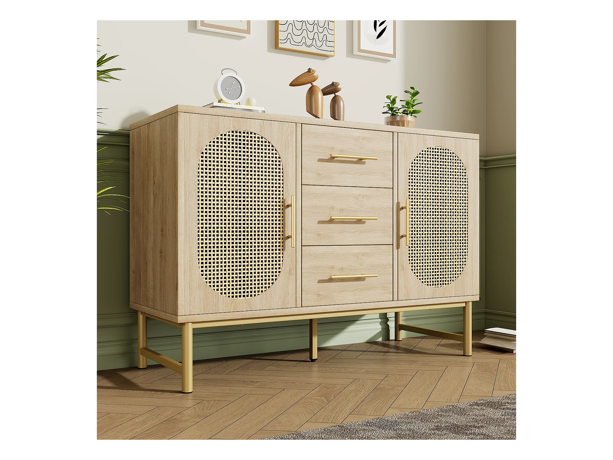 Dressoir met 3 laden en 2 rotan deuren - 120 x 40 x 74 cm - Verstelbare planken - Spaanplaat - Eiken