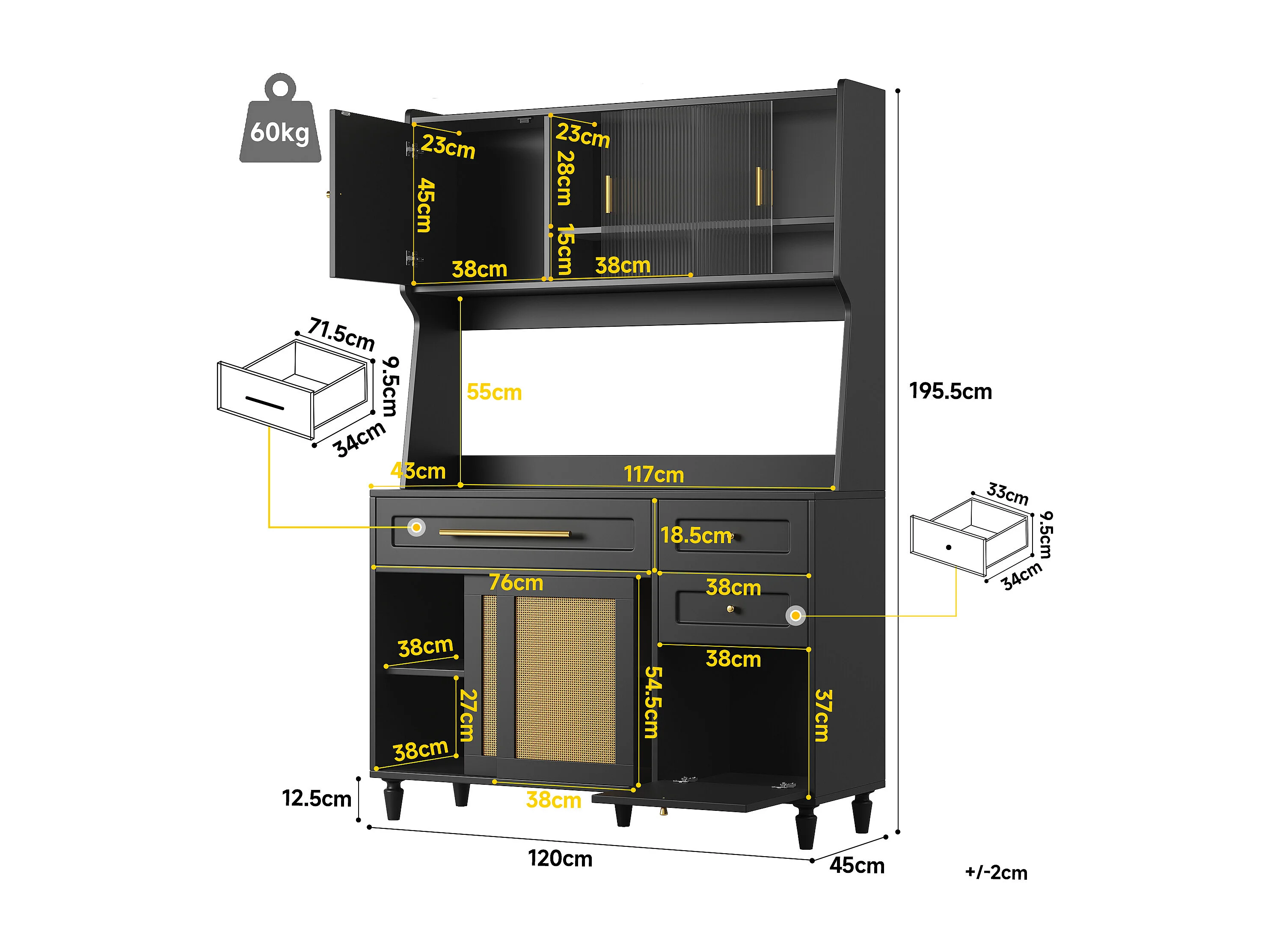 Dressoir met LED, 3 lades, verstelbare planken, PE-rotan, MDF, zwart (120x45x195,5 cm)