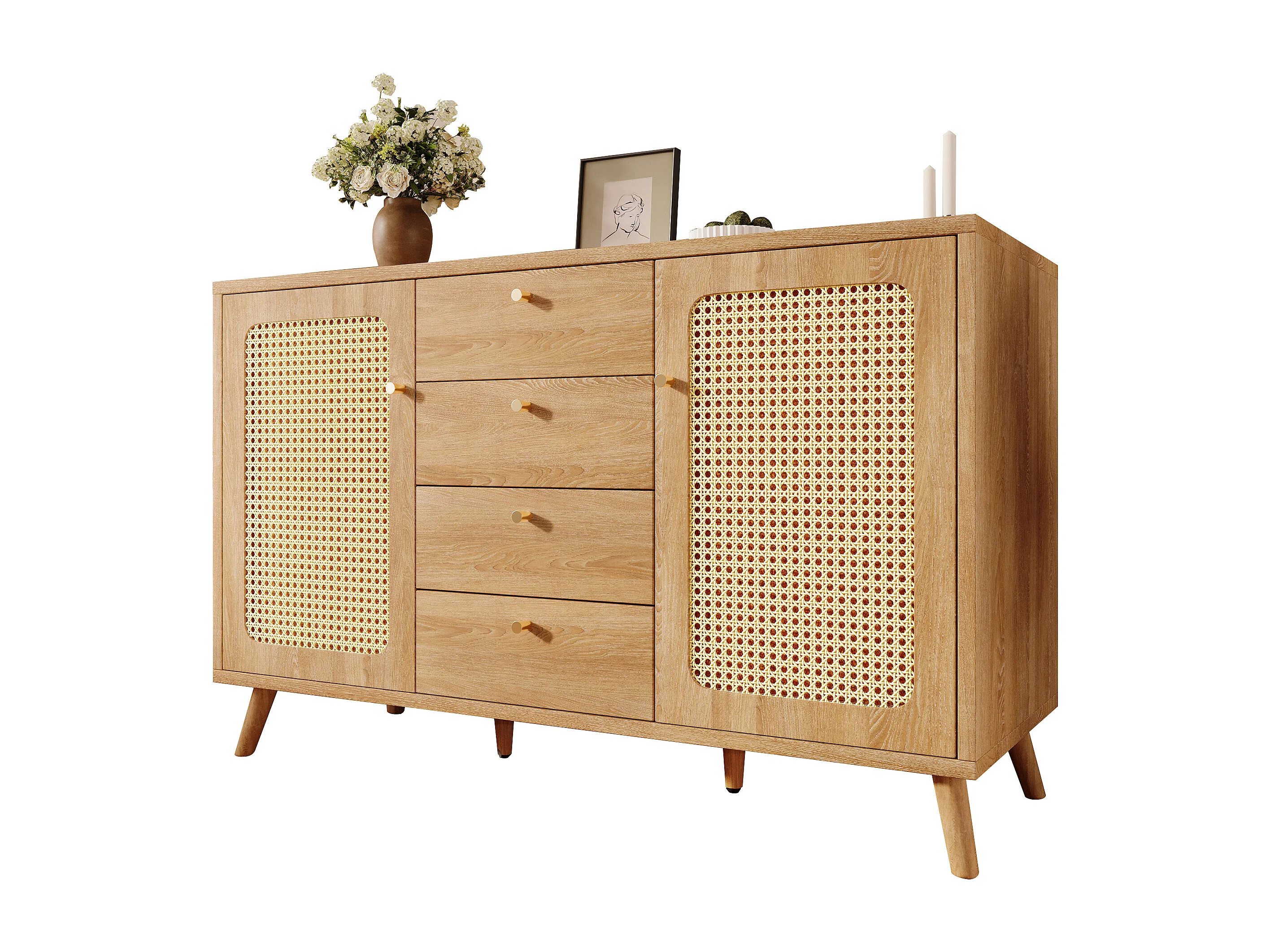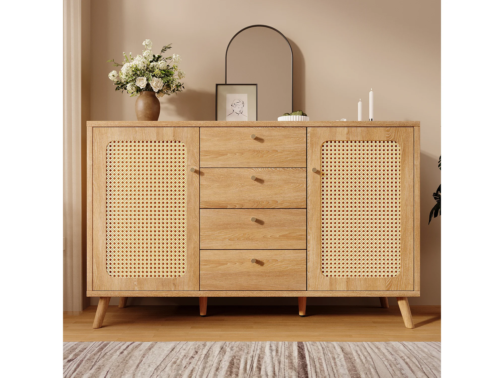 Dressoir met rotanlook voor de woonkamer - 140 x 40 x 86 cm - met 4 lades + 2 deuren + verstelbare planken - hout - licht naturel