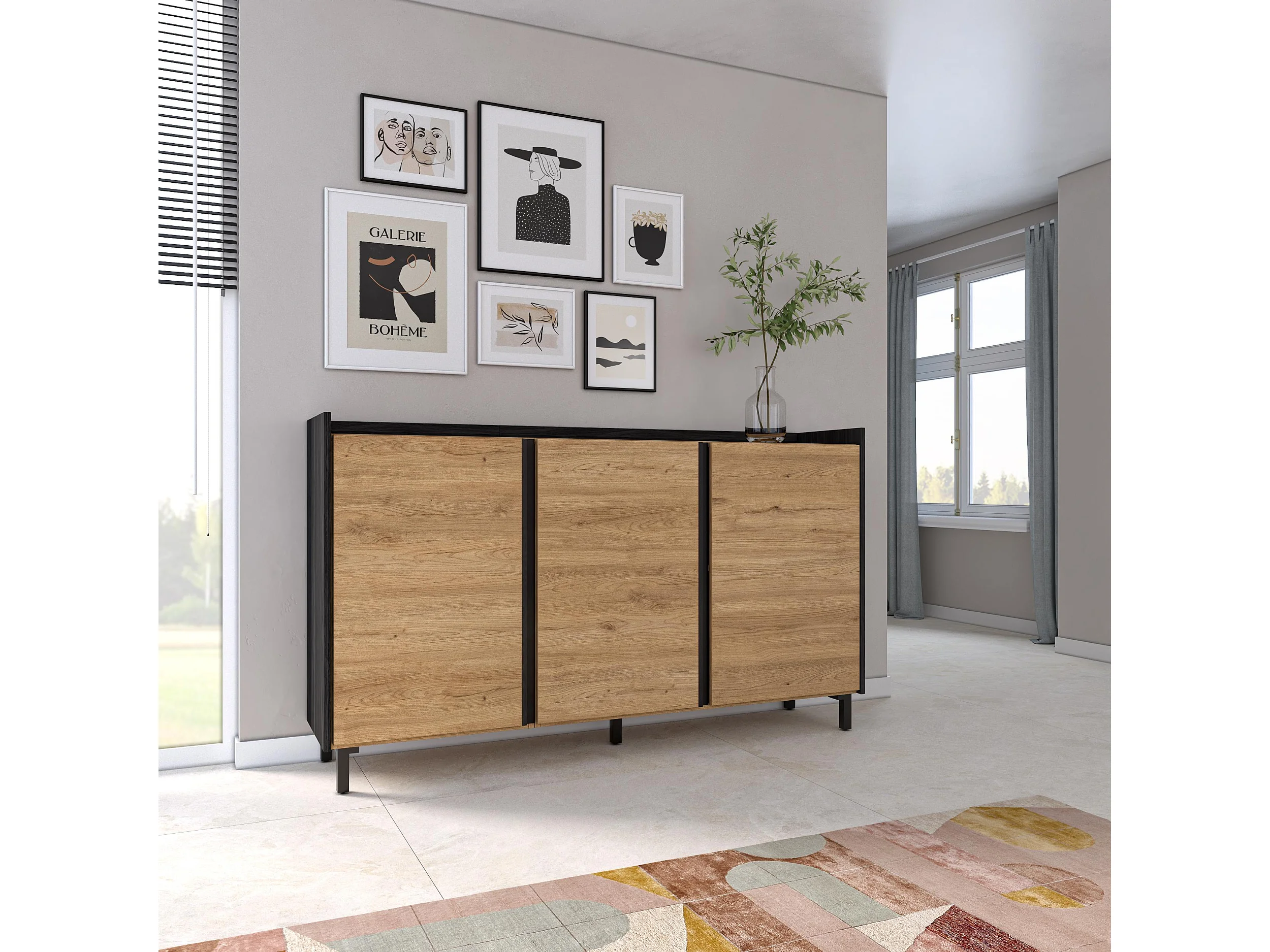 Dressoir, Opbergkast, 156x91x35 cm, 3 Deuren, Industrieel design, Eiken/Zwart