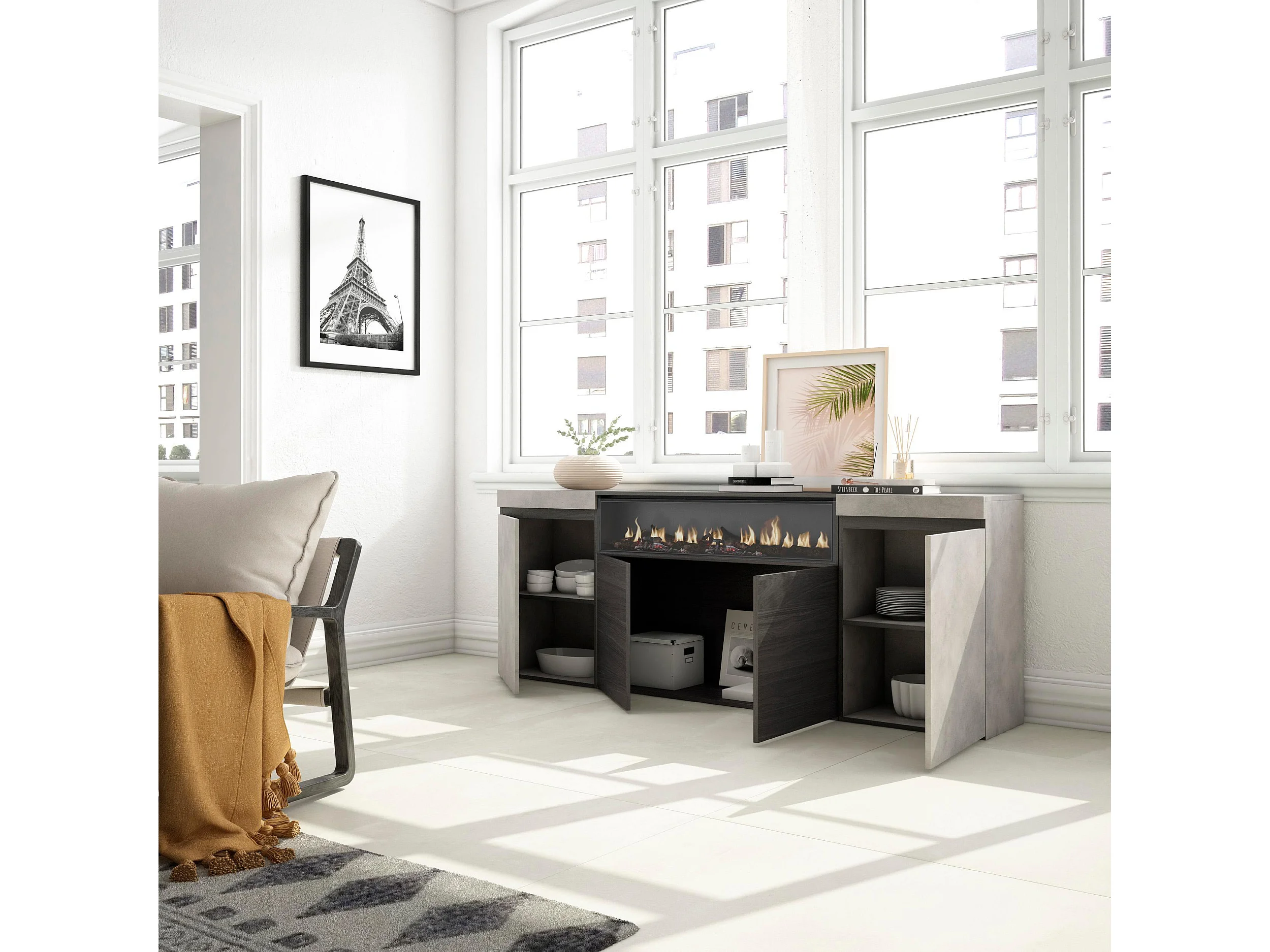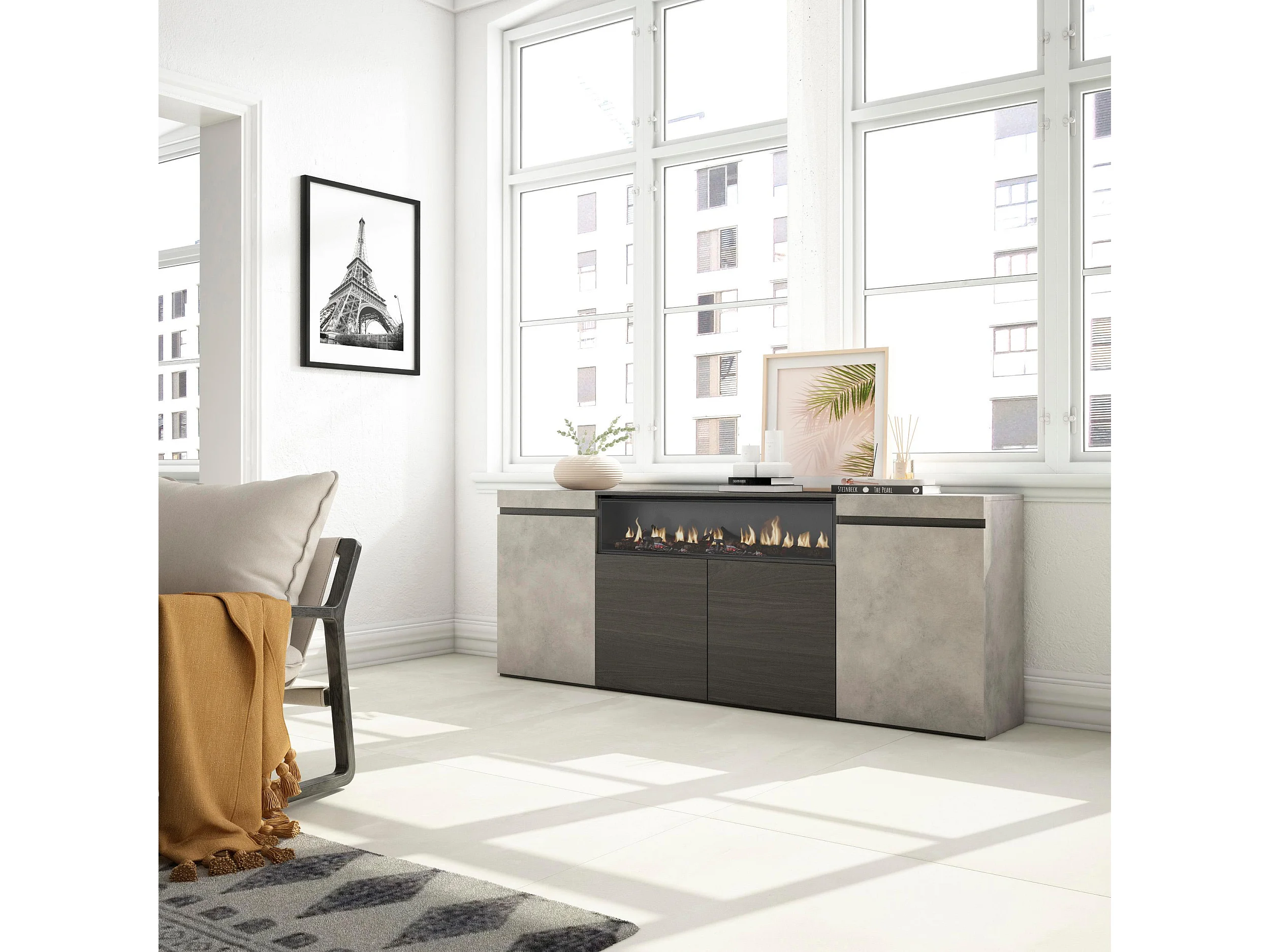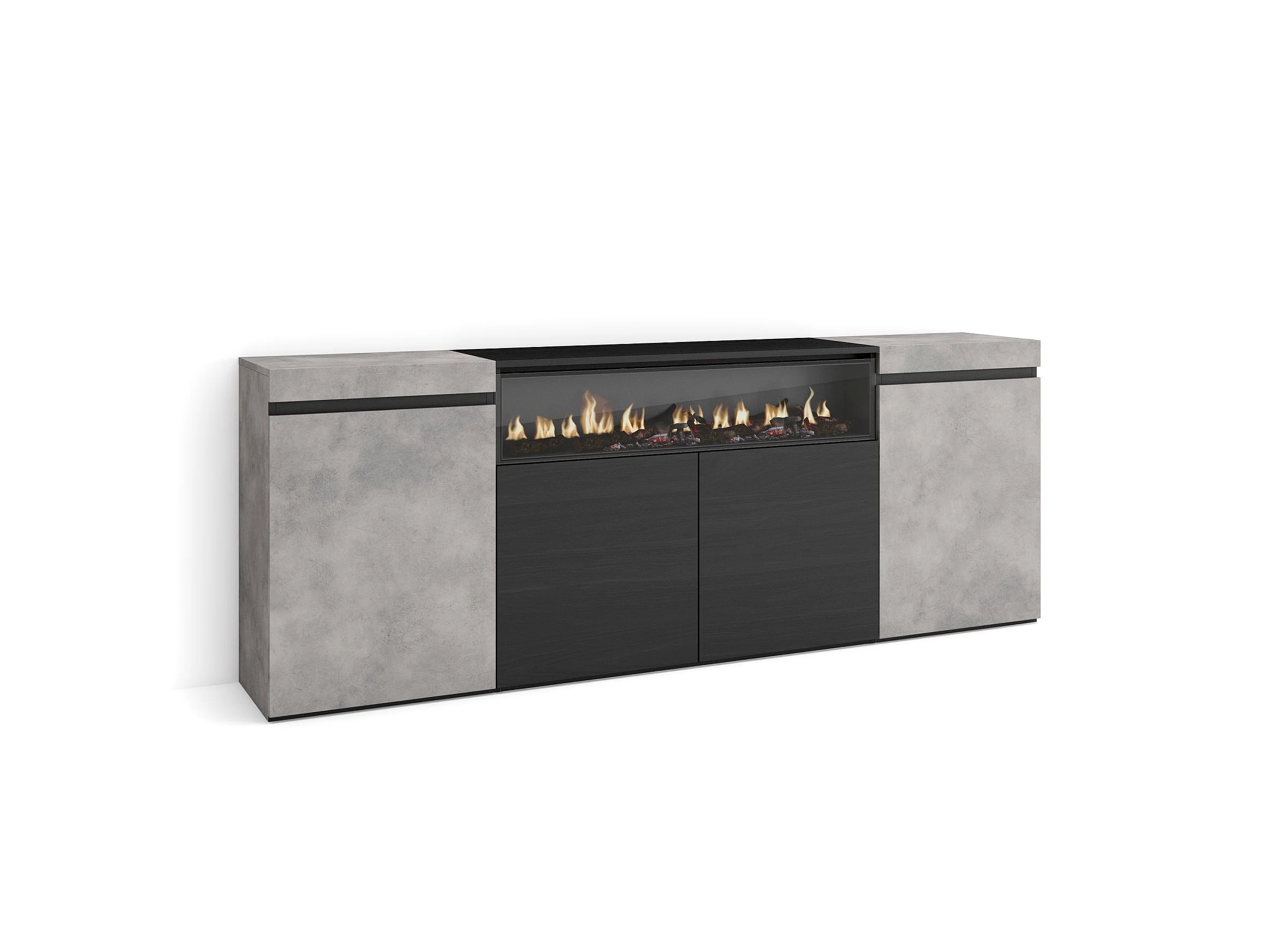 Dressoir, Opbergkast, 200x35x75cm, 4 Deuren, Elektrische haard, Cement