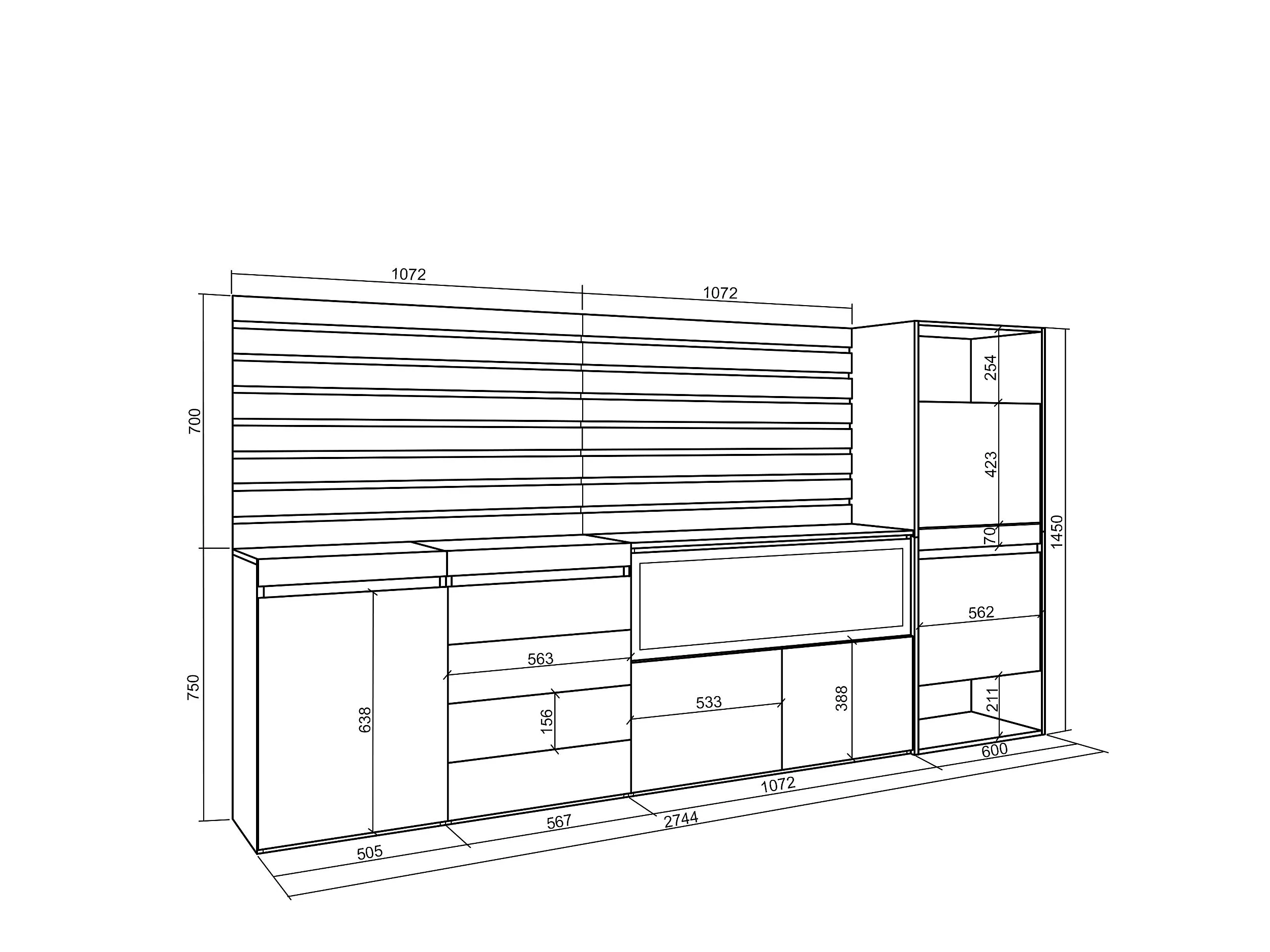 Dressoir, Opbergkast, 274x35x145cm, Voor slaapkamer, kamer, Elektrische haard XXL, Ladekast, Commode, Schoenenkast, Eiken