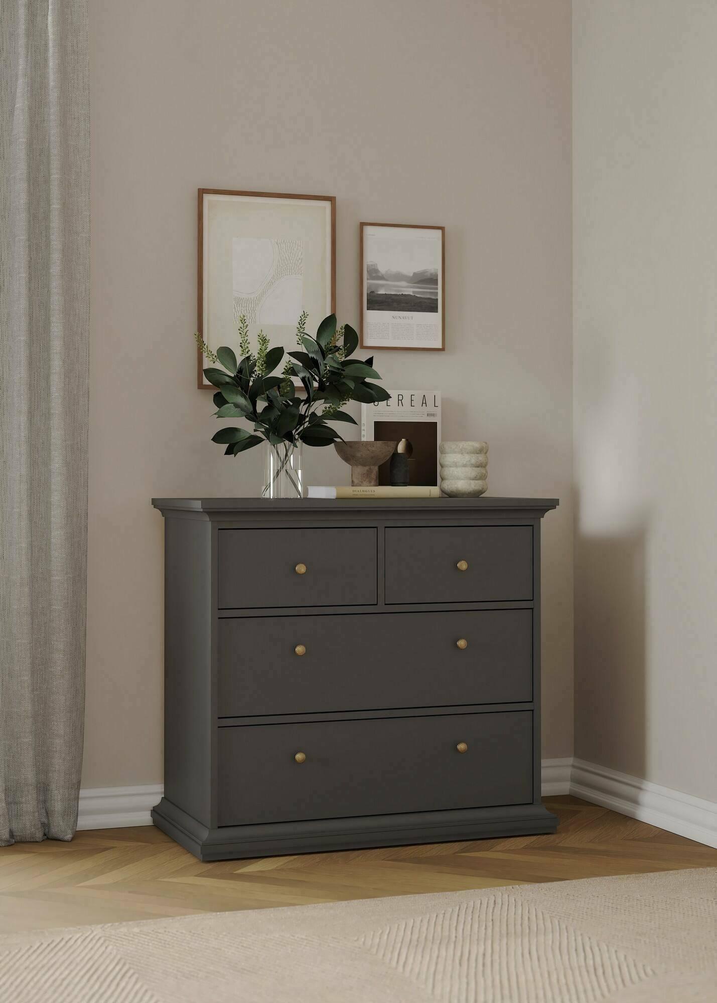 LADENKAST - Multifunctionele ladekast, Slaapkamercommode, Kast met laden, 96x49 h87 cm, Grijs. STRUCTUUR EN GEBRUIK - Ladekast met lades - Multifunctionele lage ladekast, perfect voor het op een praktische en elegante manier inrichten van een slaapkamer, woonkamer, slaapkamer, woonkamer of kast naast een kledingkast - De lades zijn zeer ruim , zodat u ze op een discrete en nette manier kunt opbergen in alles wat u nodig heeft. - Artikel met een modern en functioneel ontwerp, op het bovenoppervlak kunt u uw favoriete ornamenten plaatsen om het product een persoonlijke stijl te geven en de inrichting compleet te maken. KWALITEIT EN DESIGN - Meubelartikel met een modern en elegant design, perfect voor het inrichten van een eigentijdse en lichte omgeving - Ideaal voor wie op zoek is naar functionaliteit en ruimtebesparende oplossingen, dit product is perfect voor huizen en appartementen van elke grootte - Twee jaar garantie vanaf de datum van aankoop. TECHNISCHE EIGENSCHAPPEN - Veelzijdig meubelaccessoire, ontworpen voor eenvoudige integratie met ander meubilair - Duurzame verpakking, ontworpen voor e-commerce - Materiaal: melamine spaanplaat - Aanvullende informatie: EPA 40 CFR TSCA gecertificeerd artikel - Formaldehyde-afgifte voldoet aan IOS-richtlijnen /MAT/0181/EN 16666 - Gedemonteerd - Voorzien van montageset - Vier laden. AFMETINGEN IN CM - Ladekast: Lengte: 96,2 Breedte: 48,5 Hoogte: 86,9 - Extra afmetingen: Ladeopening: 25,7 cm