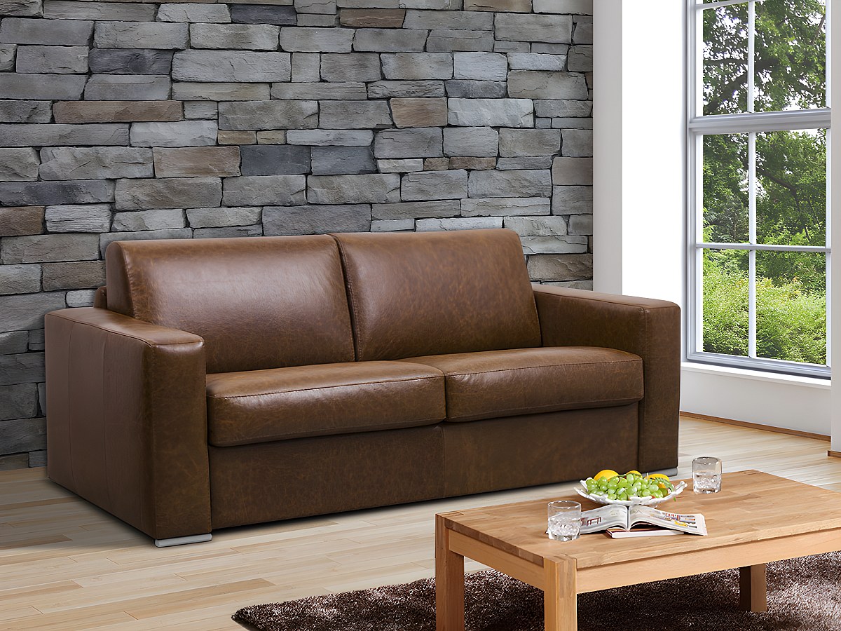 Driezits-slaapbank 100% buffelleer DELECTEA II - Kleur: vintage karamel