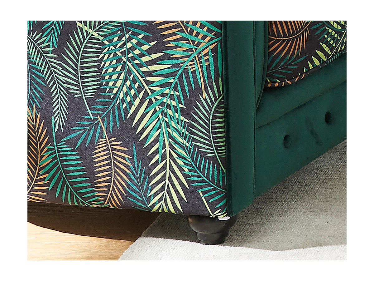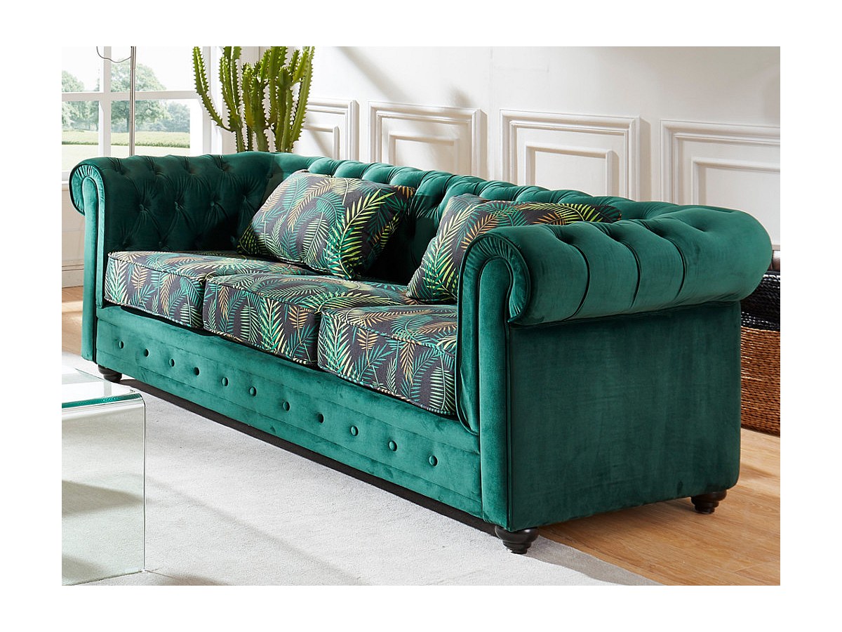 Driezitsbank en 2 fauteuils CHESTERFIELD - Fluweel groen en stof met tropische print