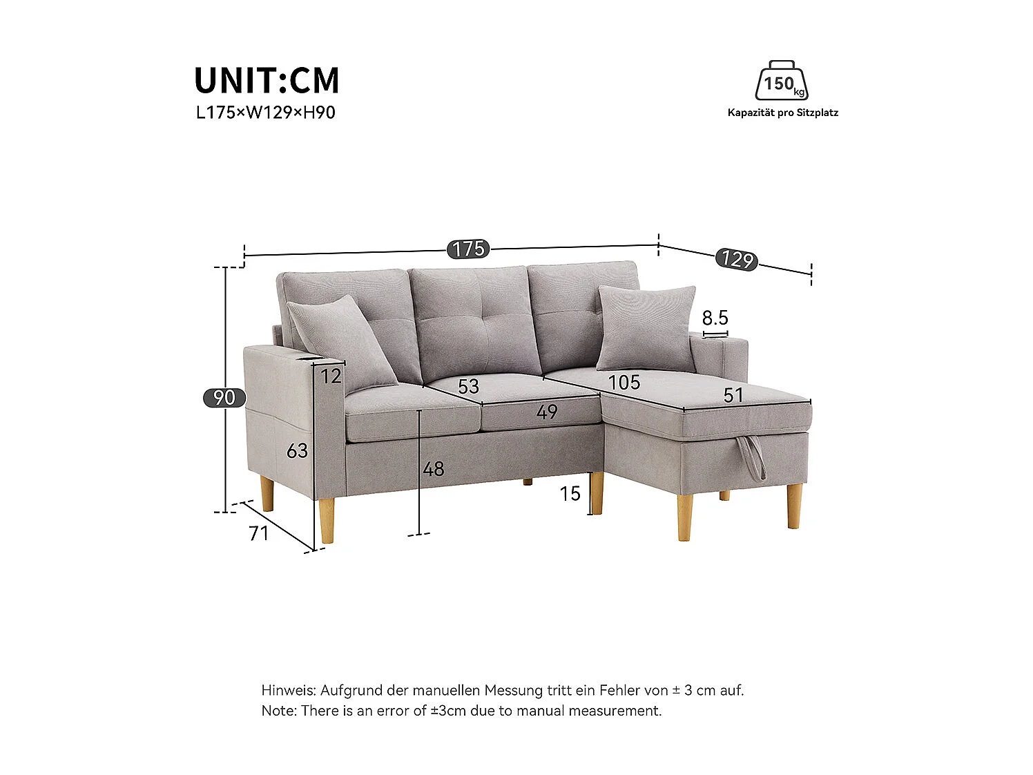 Driezitsbank in L-vorm met chaise longue, opbergvak, geïntegreerde bekerhouders en twee kussens inbegrepen, lichtgrijs