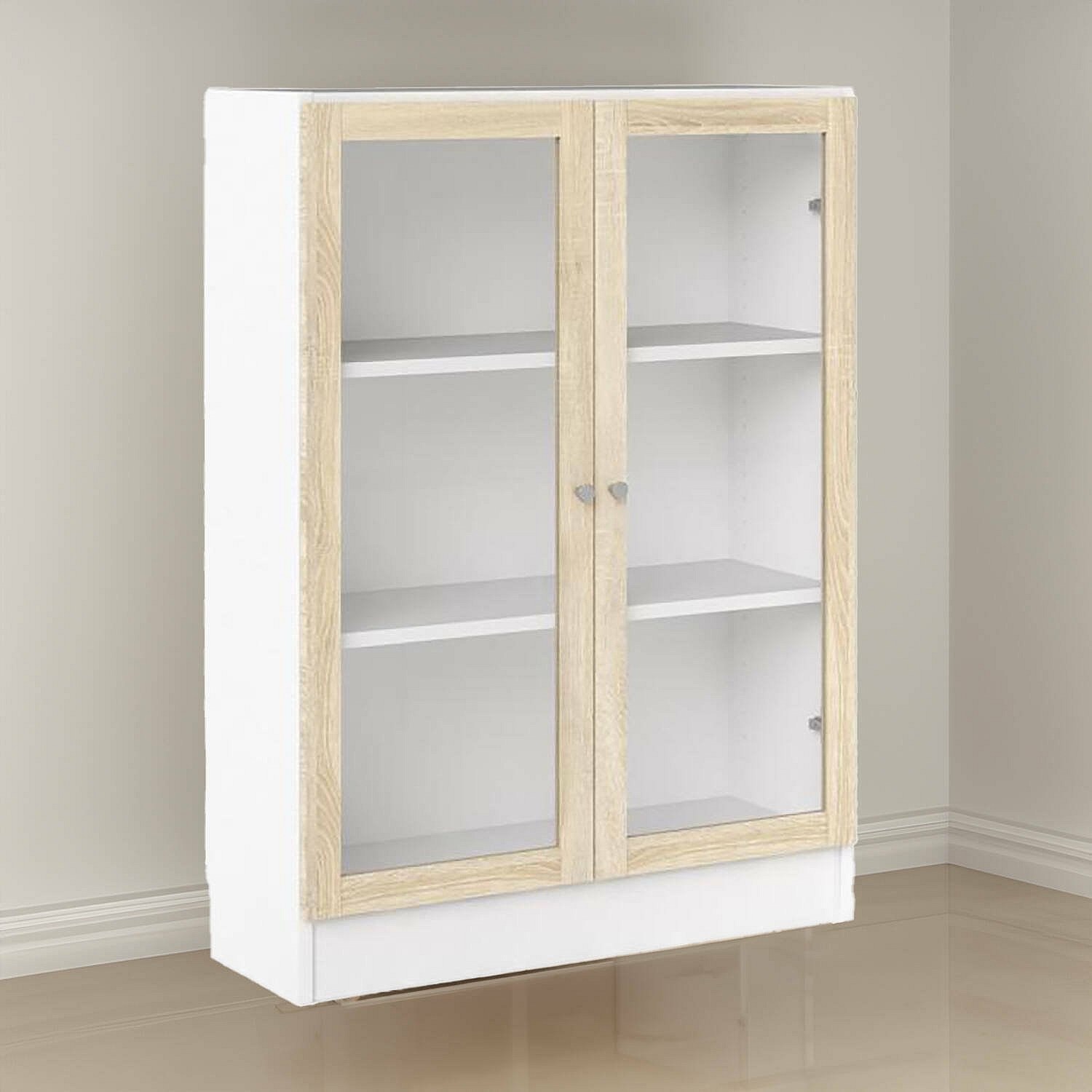 Dvarol vitrinekast, Vitrinekast, Multifunctionele vitrinekast, Woonkamerdressoir, 98x39 h200 cm, Wit en Eiken