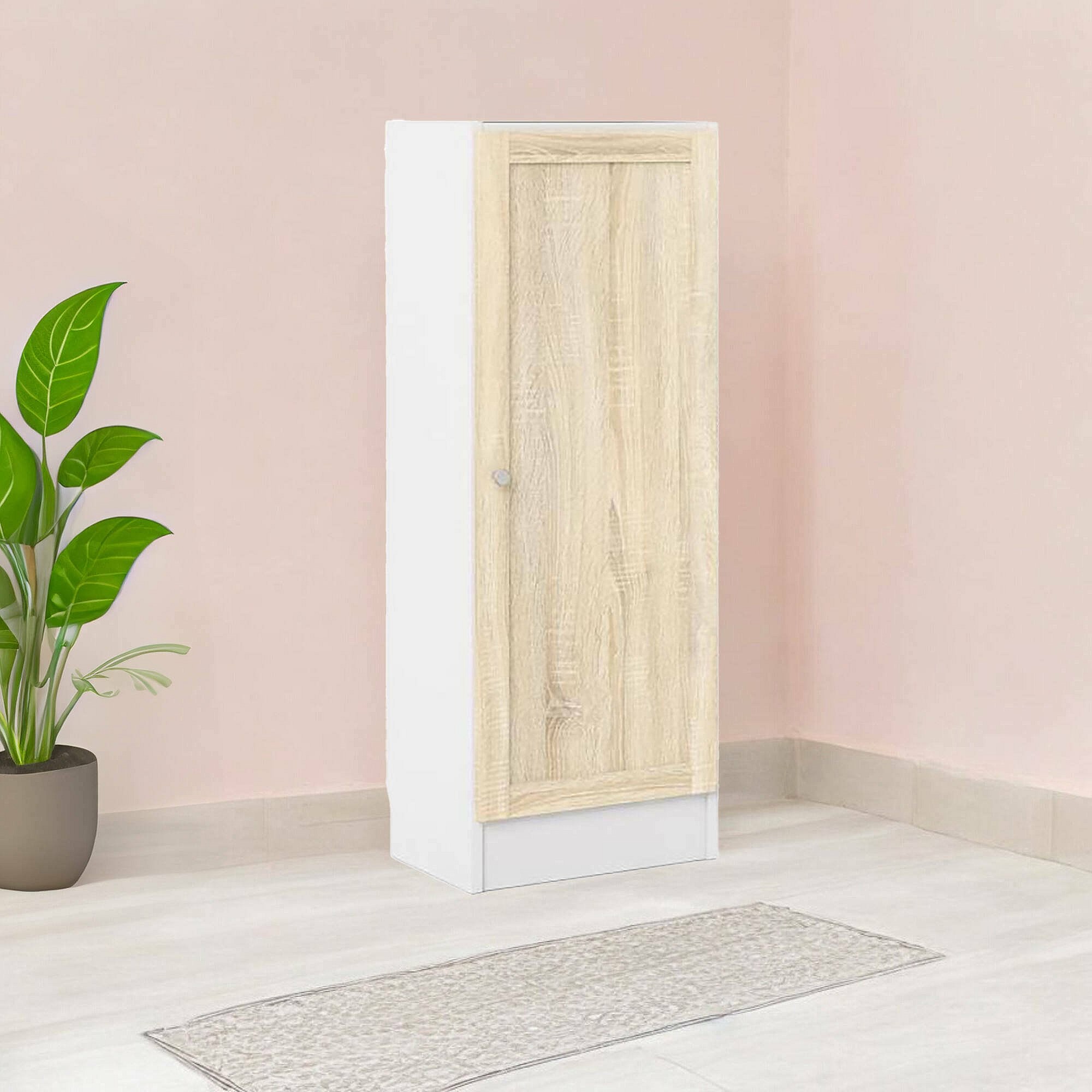 BOEKENKAST - Kantoorplank, Boekenkast, Bibliotheek, 41x28 h107 cm, Wit en Eiken. STRUCTUUR EN GEBRUIK - Multifunctionele boekenstandaard verticaal ontwikkeld, met een modern en ruimtebesparend ontwerp - Dankzij de structuur uitgerust met planken en planken is het mogelijk om boeken, documenten of decoratieve voorwerpen naar behoefte op de planken te plaatsen - Deze Multifunctionele boekenkast is modern en perfect om te plaatsen in omgevingen met ruimtevereisten - Ideaal meubelstuk voor de inrichting van woonkamer, woonkamer, slaapkamer, kinderkamer, kantoor of thuisstudio. KWALITEIT EN DESIGN - Meubelartikel met een modern en elegant design, perfect voor het inrichten van een eigentijdse en lichte omgeving - Ideaal voor wie op zoek is naar functionaliteit en ruimtebesparende oplossingen, dit product is perfect voor huizen en appartementen van elke grootte - Twee jaar garantie vanaf de datum van aankoop. TECHNISCHE EIGENSCHAPPEN - Veelzijdig meubelaccessoire, ontworpen voor eenvoudige integratie met ander meubilair - Duurzame verpakking, ontworpen voor e-commerce - Materiaal: melamine spaanplaat - Aanvullende informatie: EPA 40 CFR TSCA gecertificeerd artikel - Formaldehyde-afgifte voldoet aan IOS-richtlijnen /MAT/0181/EN 17358 - Gedemonteerd - Voorzien van montageset - Eén draaideur. AFMETINGEN IN CM - Boekenkast: Lengte: 40,6 Breedte: 28,3 Hoogte: 107,2 - Extra afmetingen: Deuropening: 39 cm