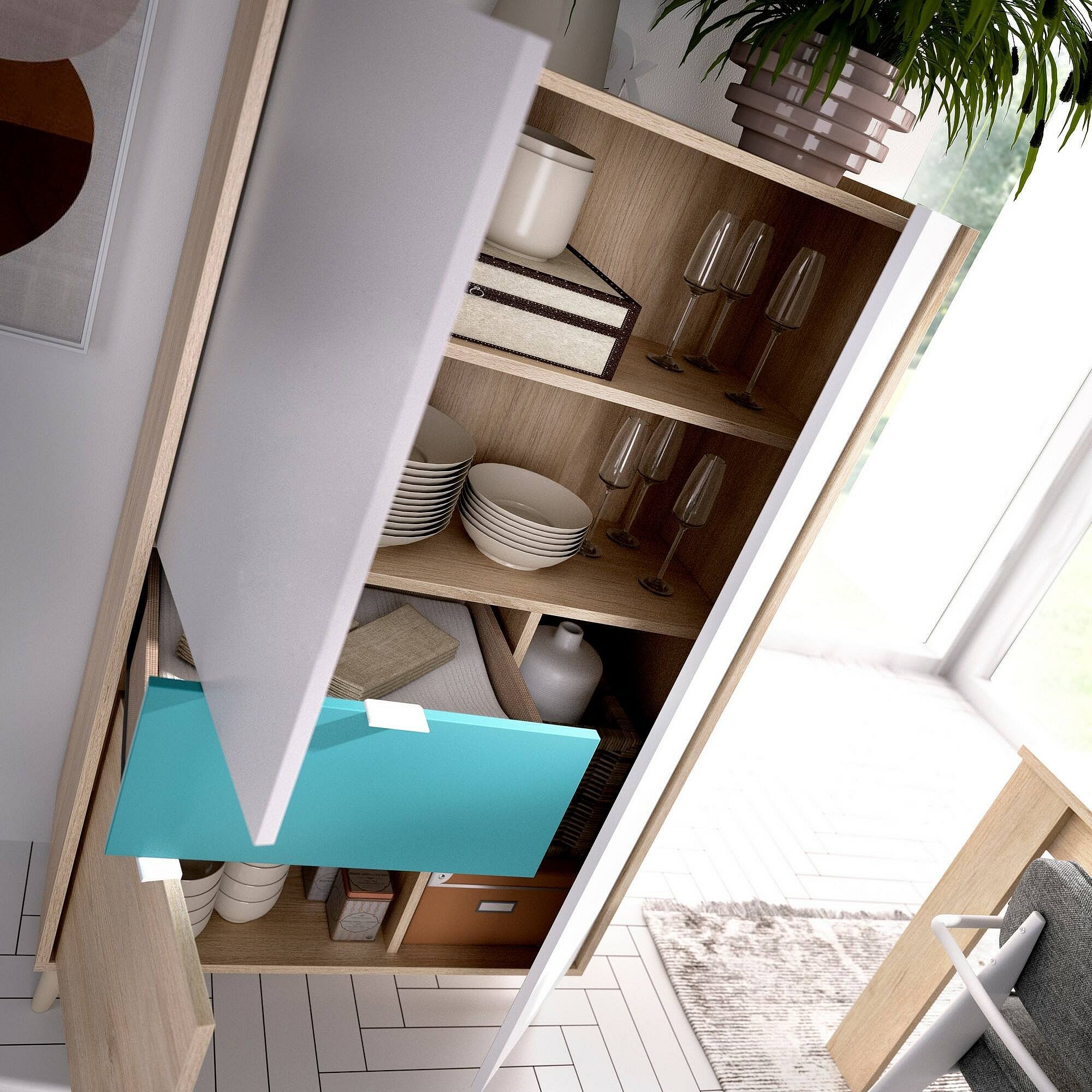 Spino Dressoir, Woonkamerkastbuffet, Modern woonkamerdressoir met 4 deuren, 80x40h191 cm, Wit en Eiken