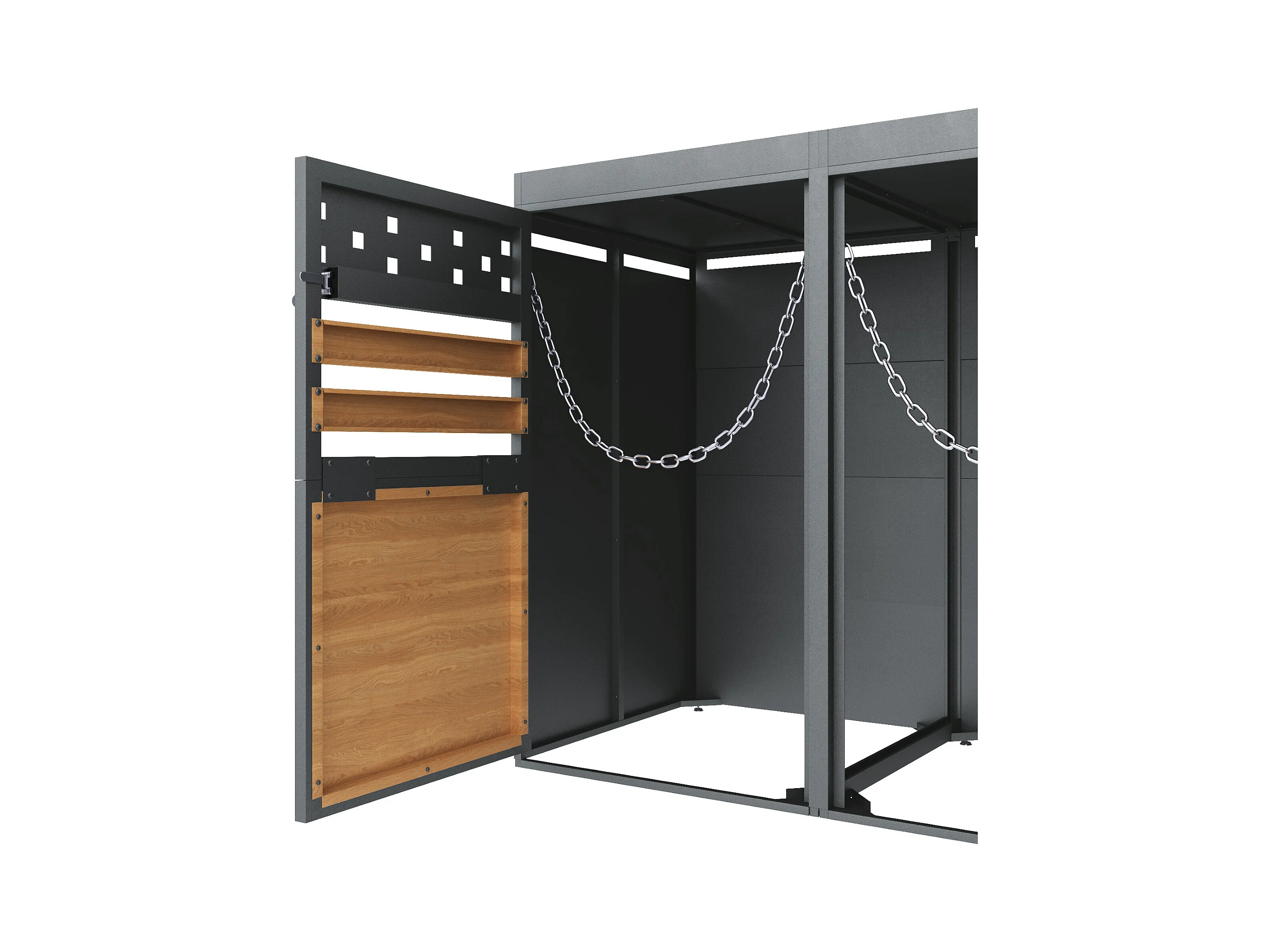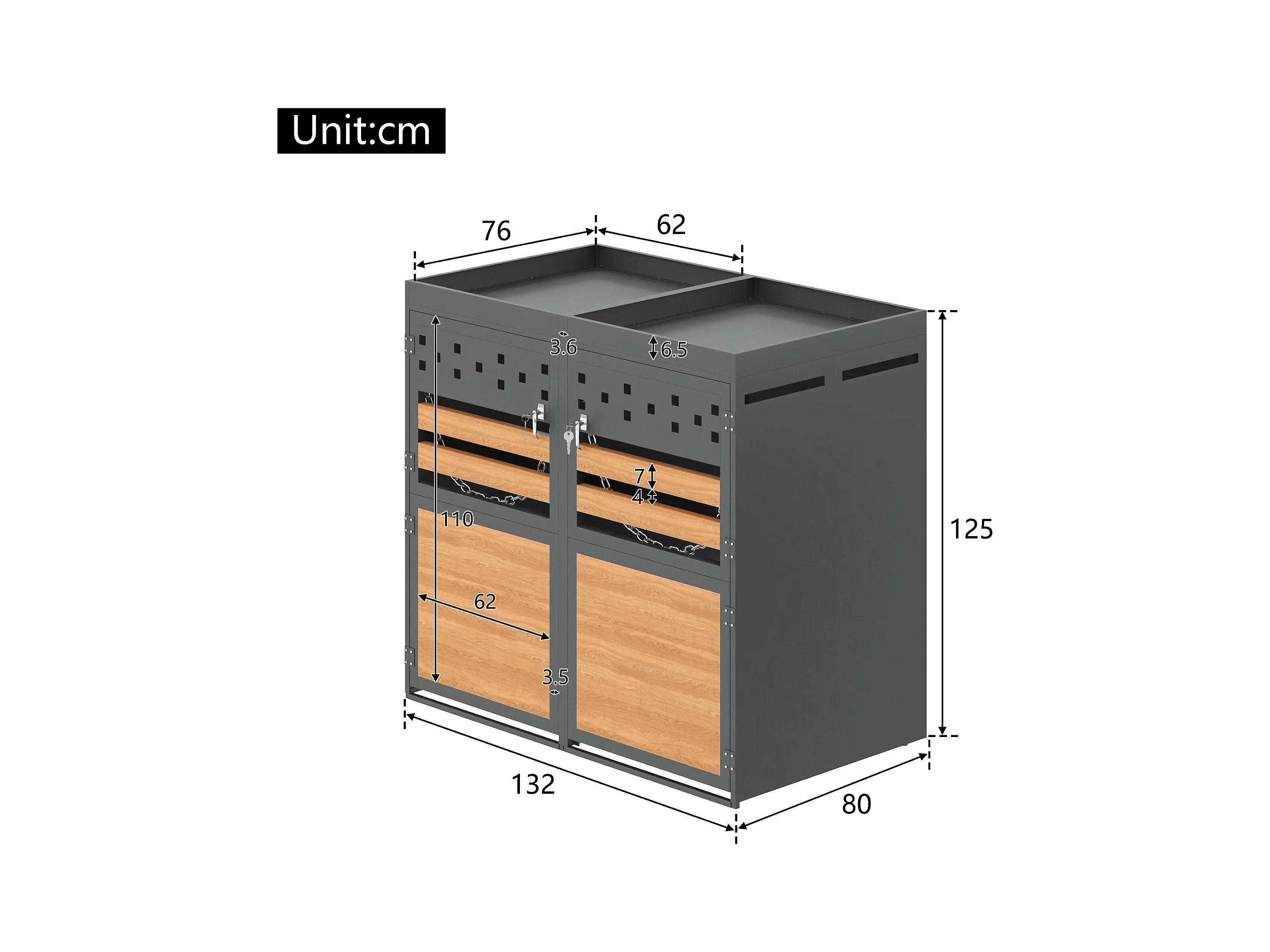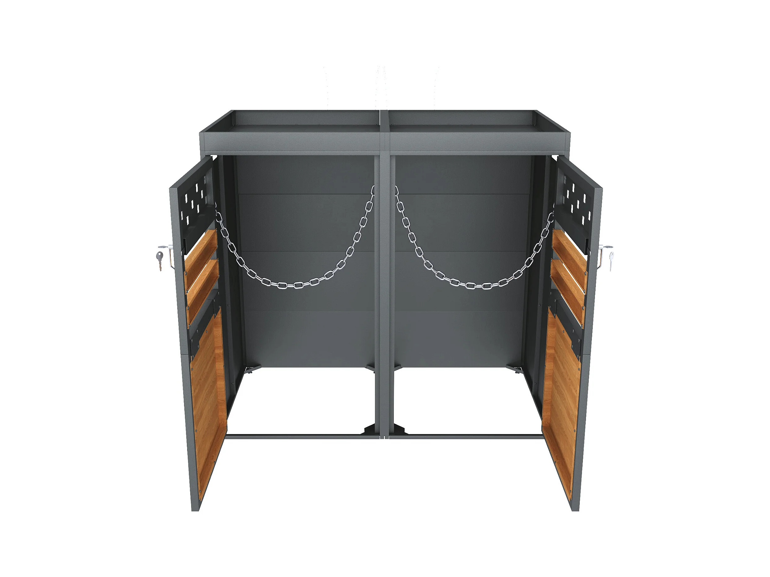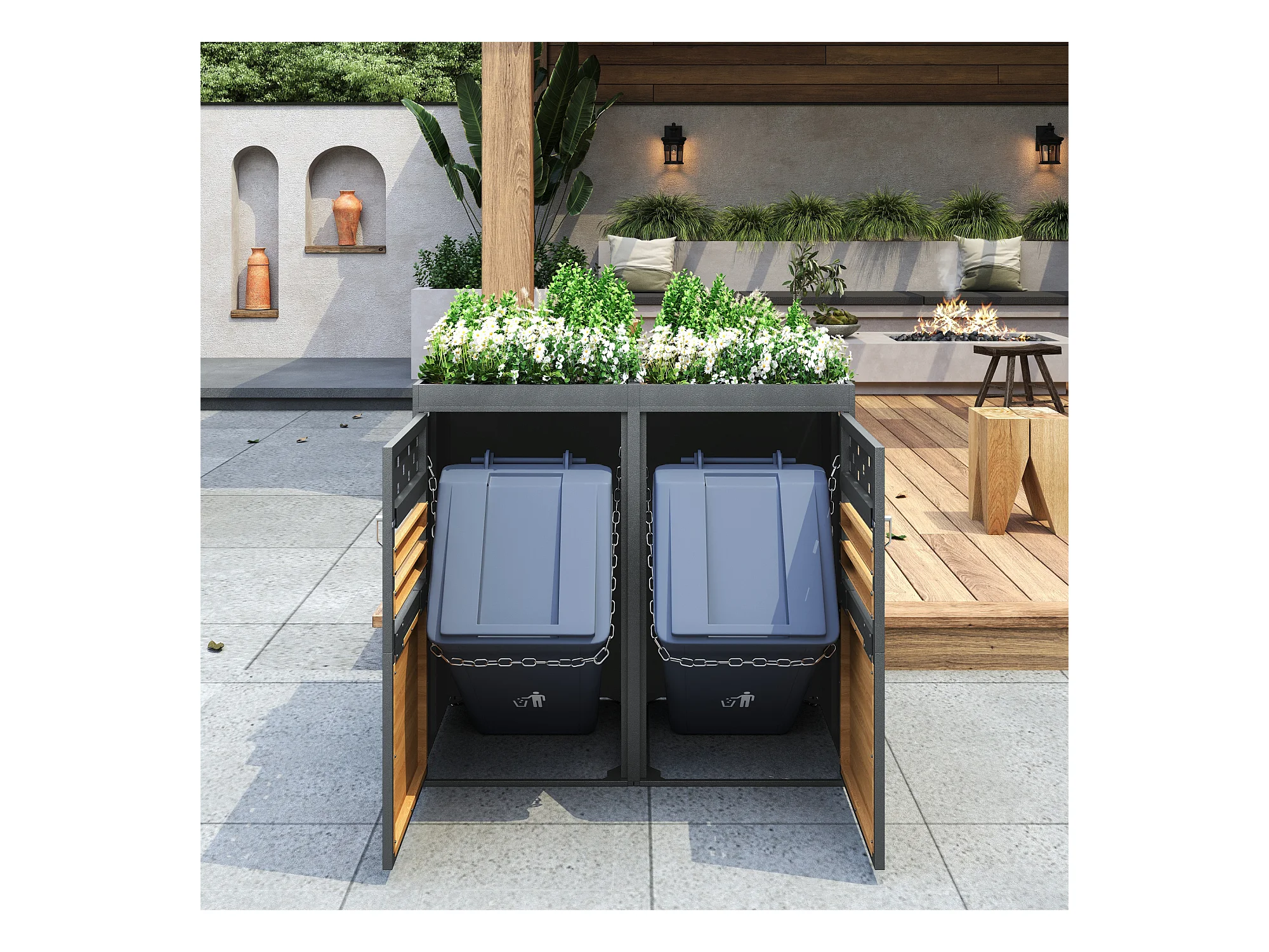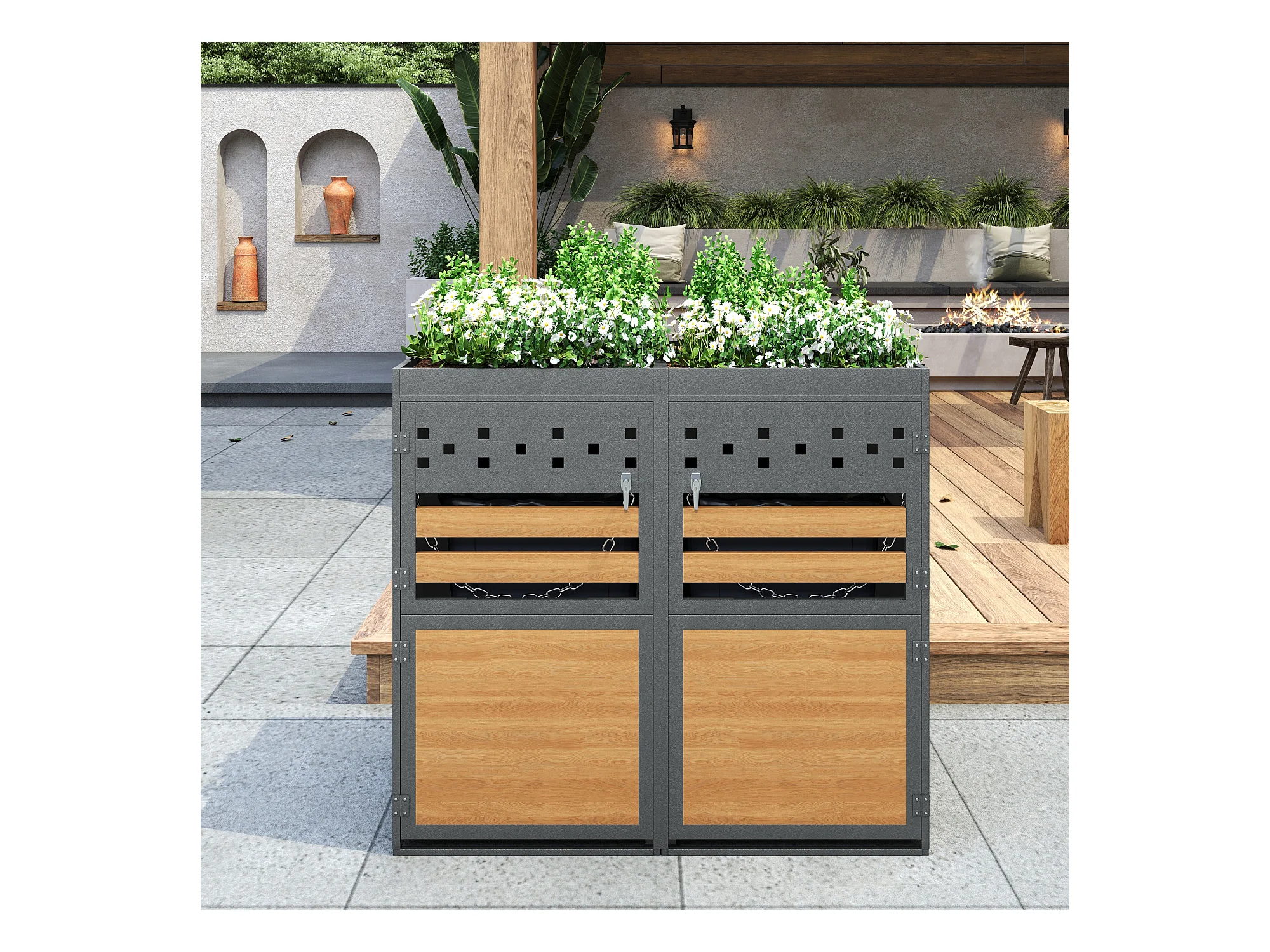 Dubbele vuilnisbakafdekking - 2x240L - deur donker met houtachtig uiterlijk - Vervangbaar - roestvrij staal - met ventilatiegaten - ingebouwde bloempot - grijs