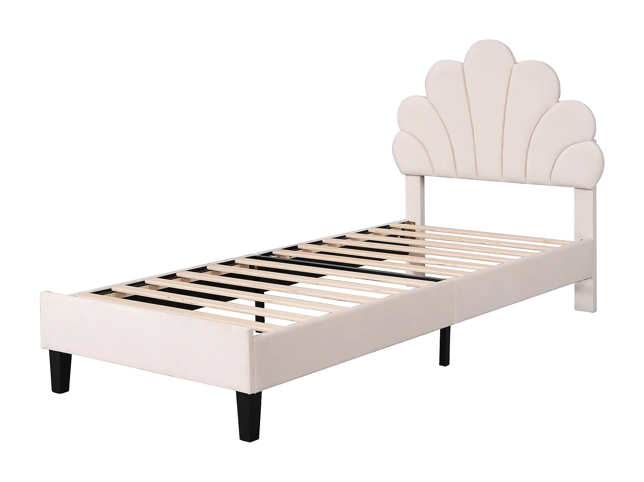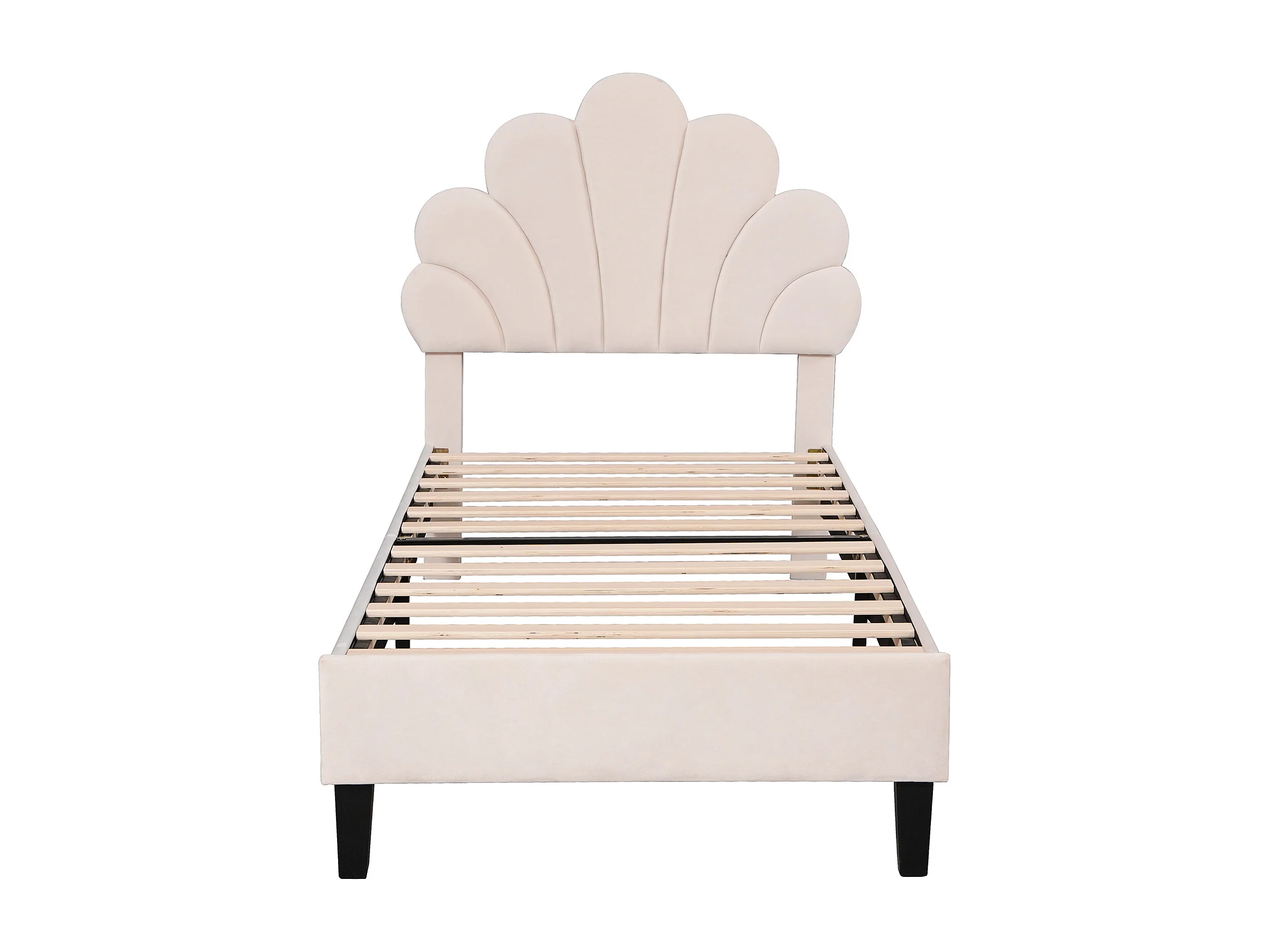 Eenpersoonsbed 90x200 cm - Kinderbed met bloemvormig hoofdbord en lattenbodem - beige fluweel