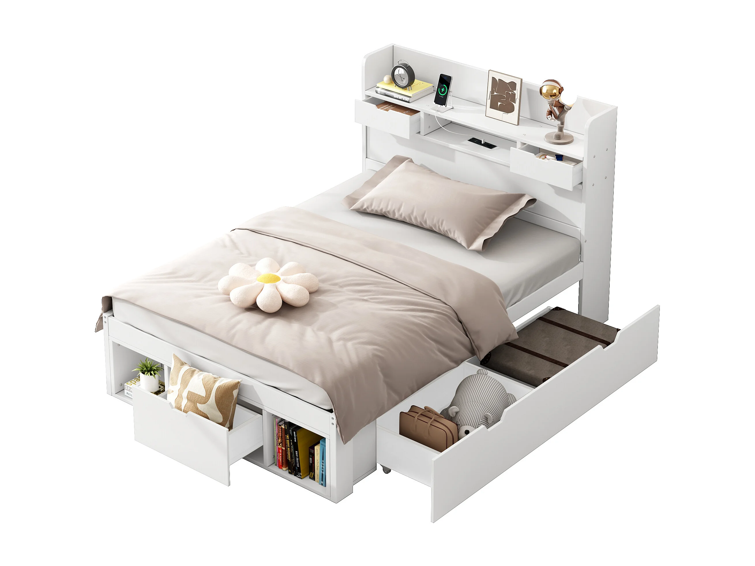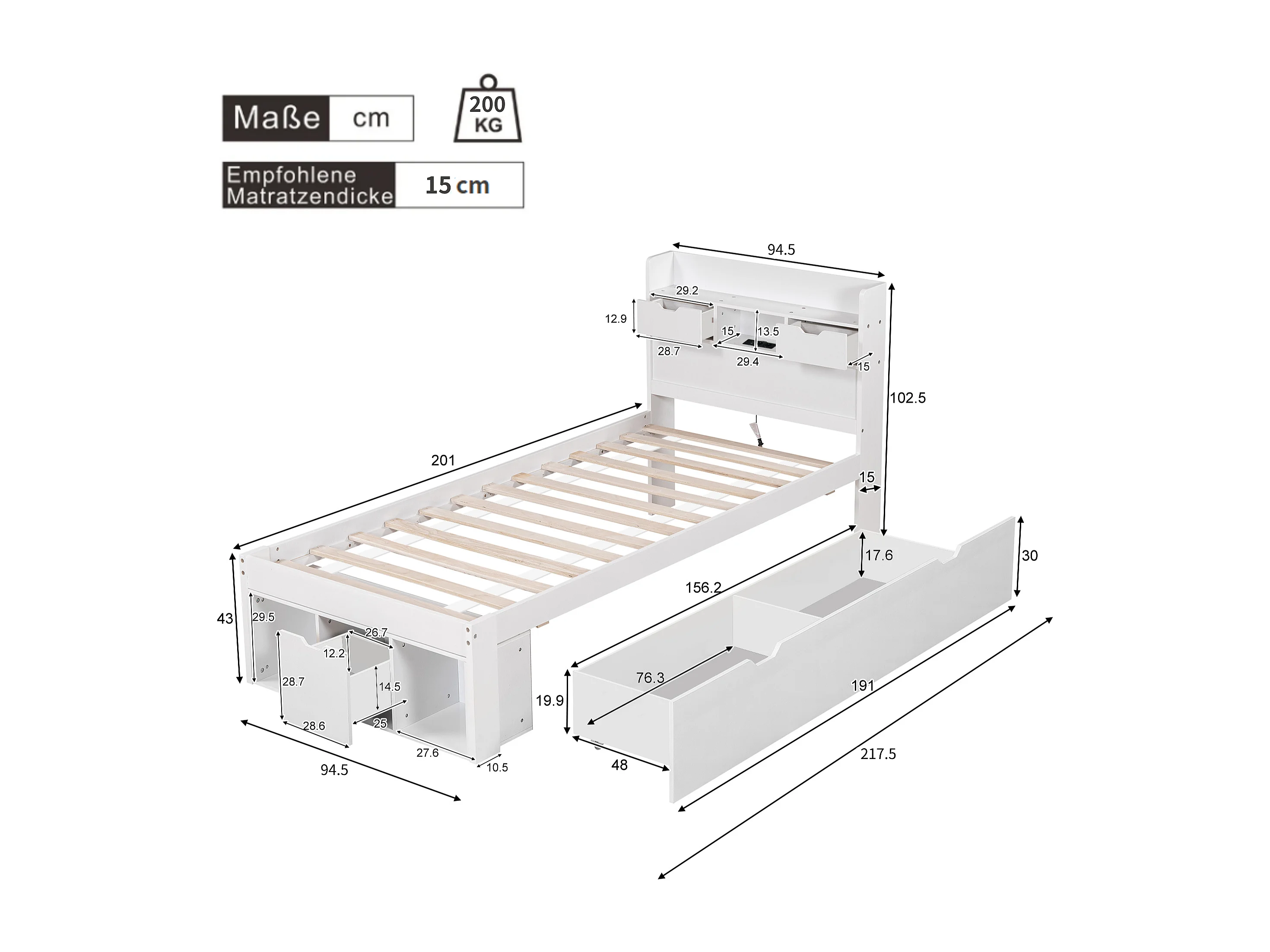 Eenpersoonsbed, 90x200cm, met USB-aansluiting & lades & opbergruimte, kinder- en tienerbed, multifunctioneel, wit (L90xD200xH60cm)