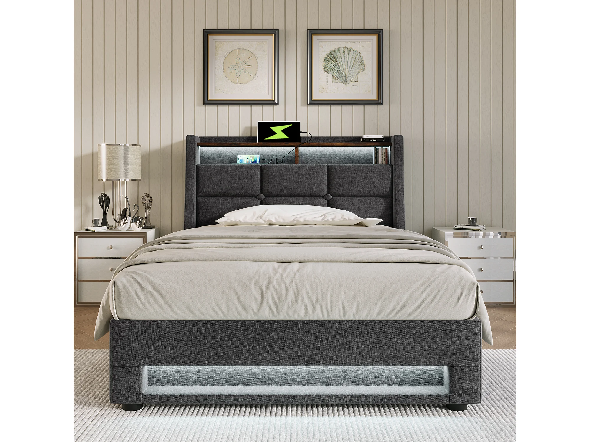 Eenpersoonsbed Gepolsterd 90x200 Cm Met LED En Usb-poort, Metaalframe, Stof Linnen, Met Matras Inbegrepen