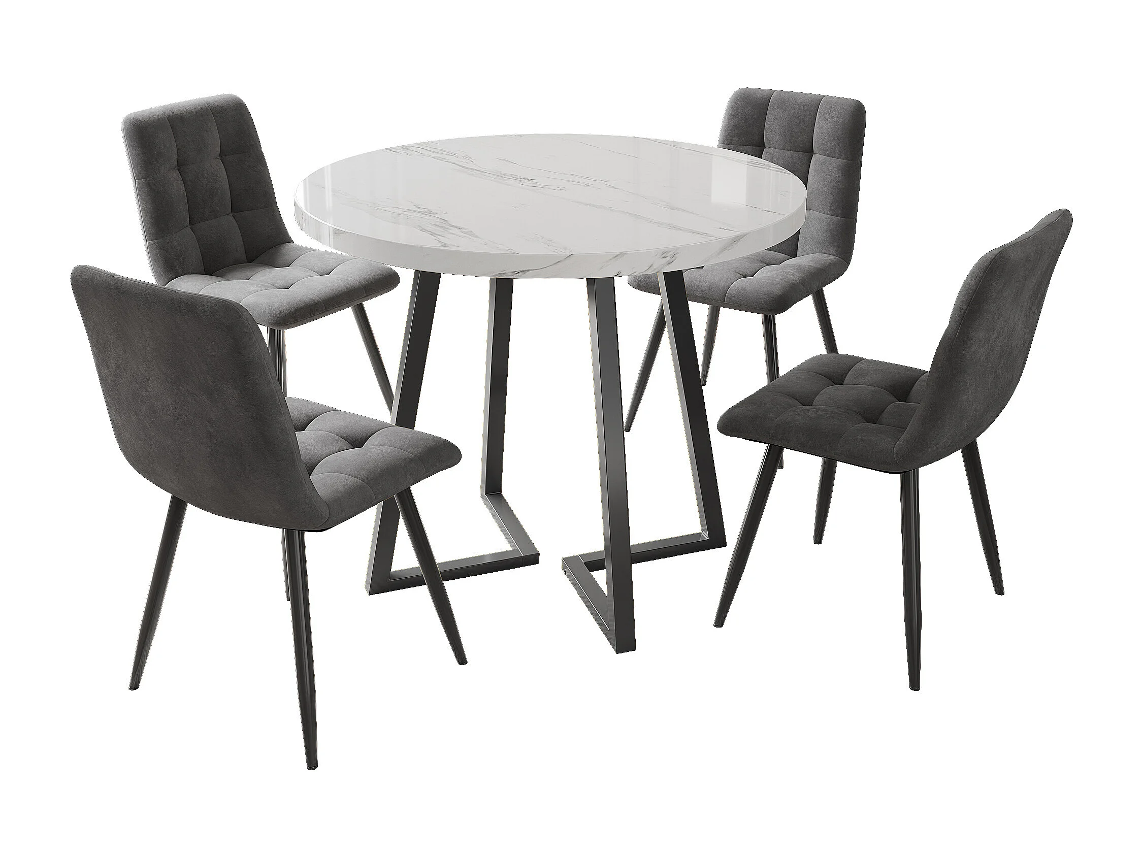 Eetkamerset (5-delig), moderne ronde tafel met zwarte metalen poten, wit MDF-blad, 4 grijze fluwelen stoelen (80x80x75 cm)
