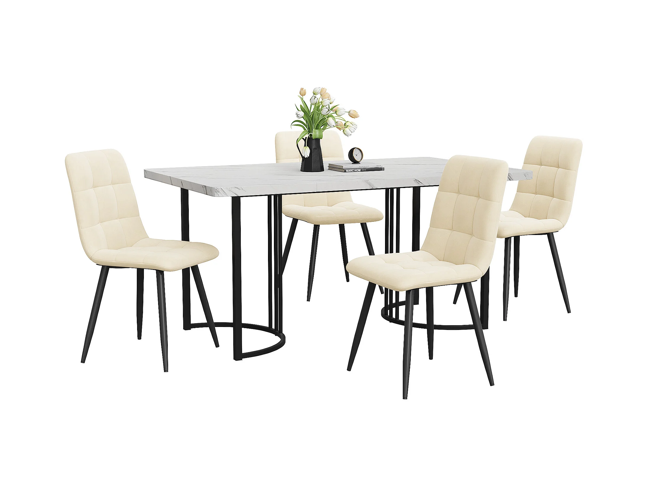 Eetkamerset van 5 stuks, tafel 140x80 cm met 4 beige fluwelen stoelen, zwarte en gouden metalen poten, wit MDF (140x80x75 cm)
