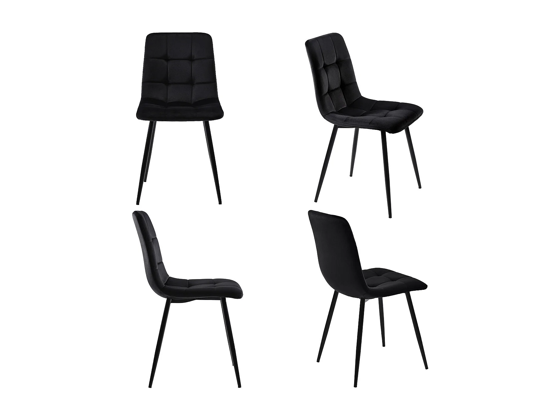 Eetkamerstoelenset (4 stuks): Zwarte fluwelen designstoel met rugleuning en metalen frame.