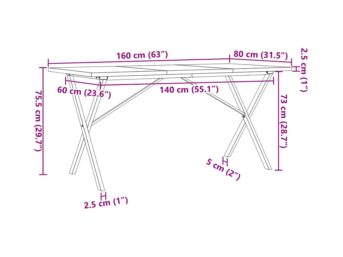 Eettafel X-frame 160x80x75,5 cm massief grenenhout en staal