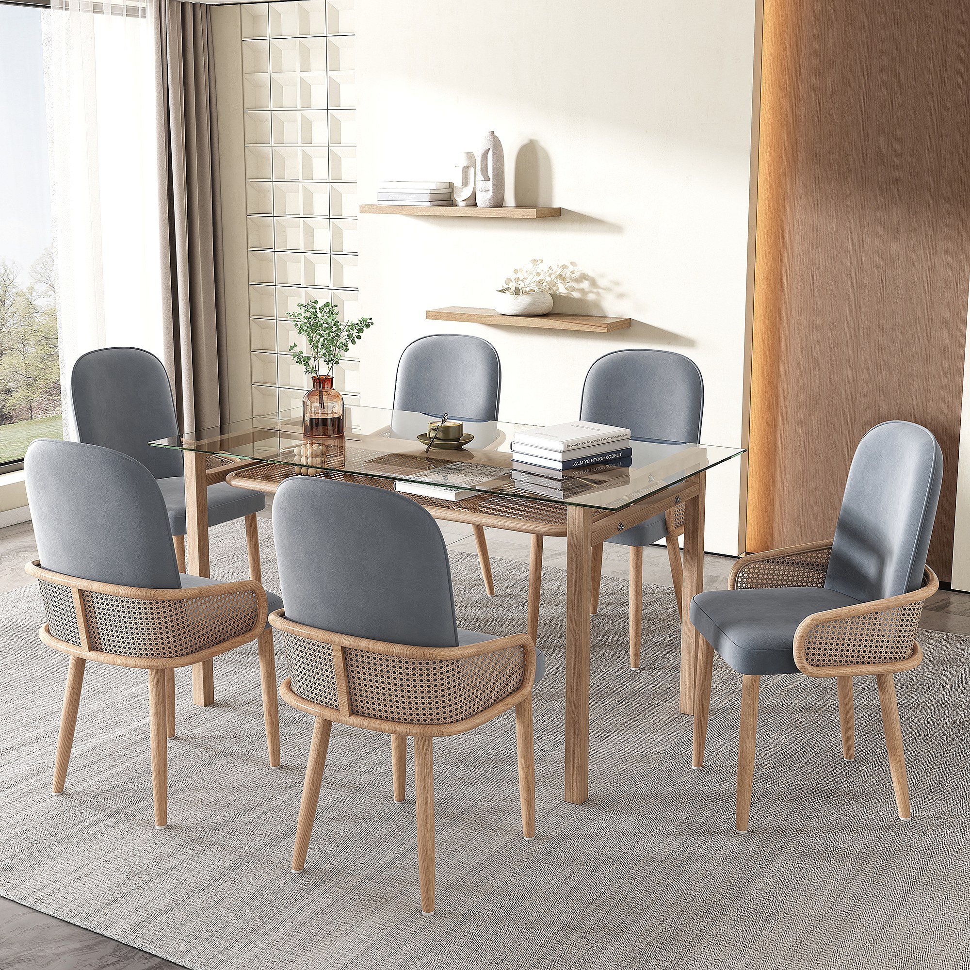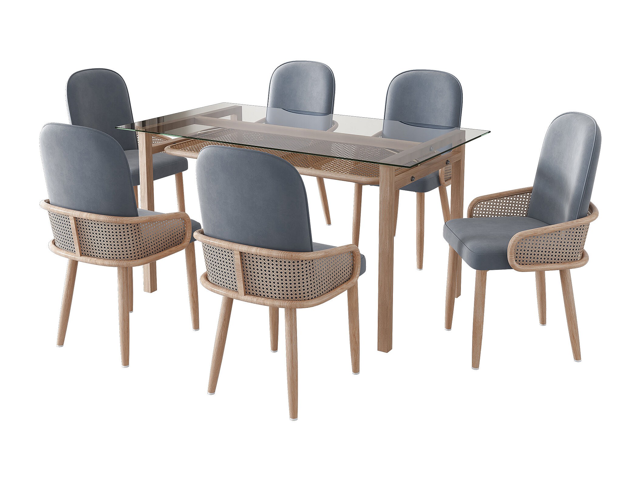 Eettafelset (110x65x74 cm) + 6 grijze fluwelen stoelen - glazen tafelblad metalen poten