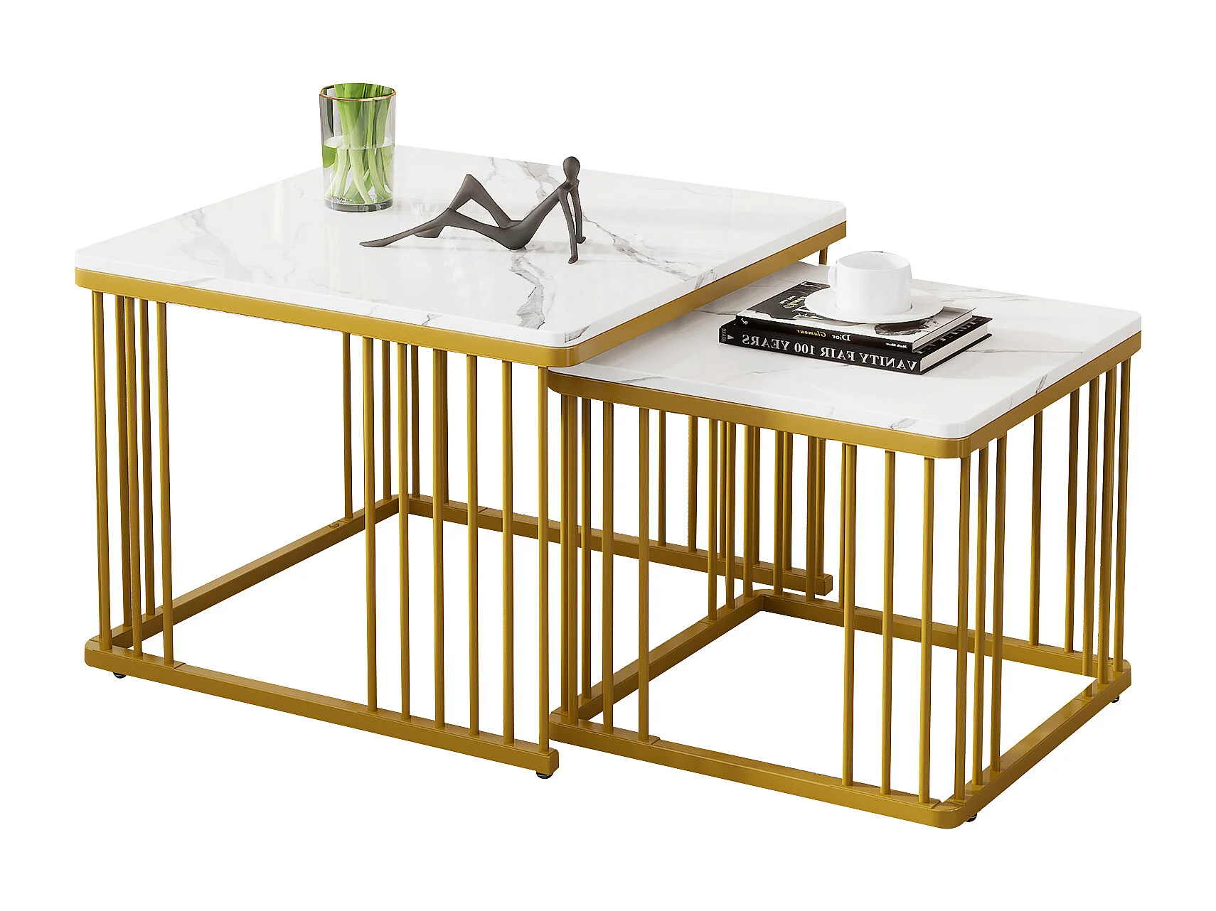 Salontafel 60x60x45 cm en 45x45x40 cm vierkant hoogglans marmerlook, gouden poten, MDF, wit