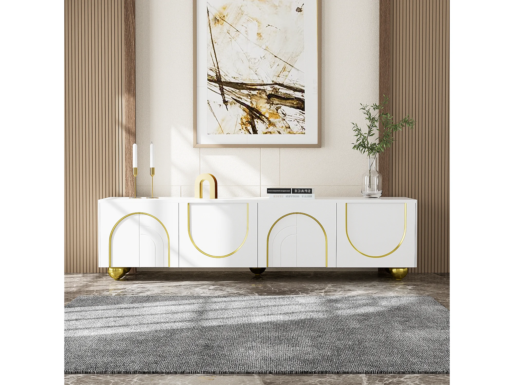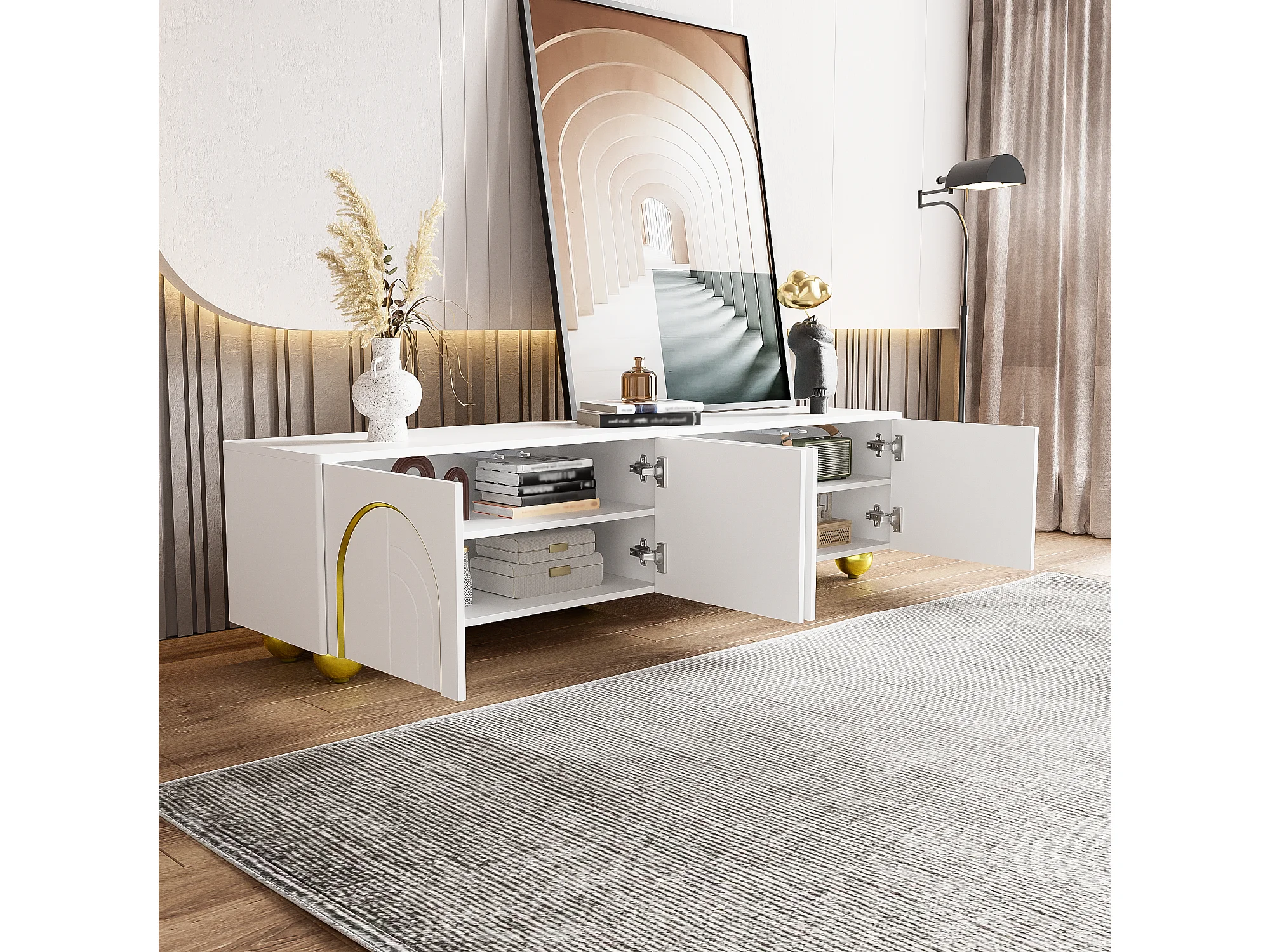 Elegante tv-kast met gouden versieringen, 2 deuren en laden, MDF-structuur, wit en goud, voor tv's tot 70 inch (170x40x50 cm)