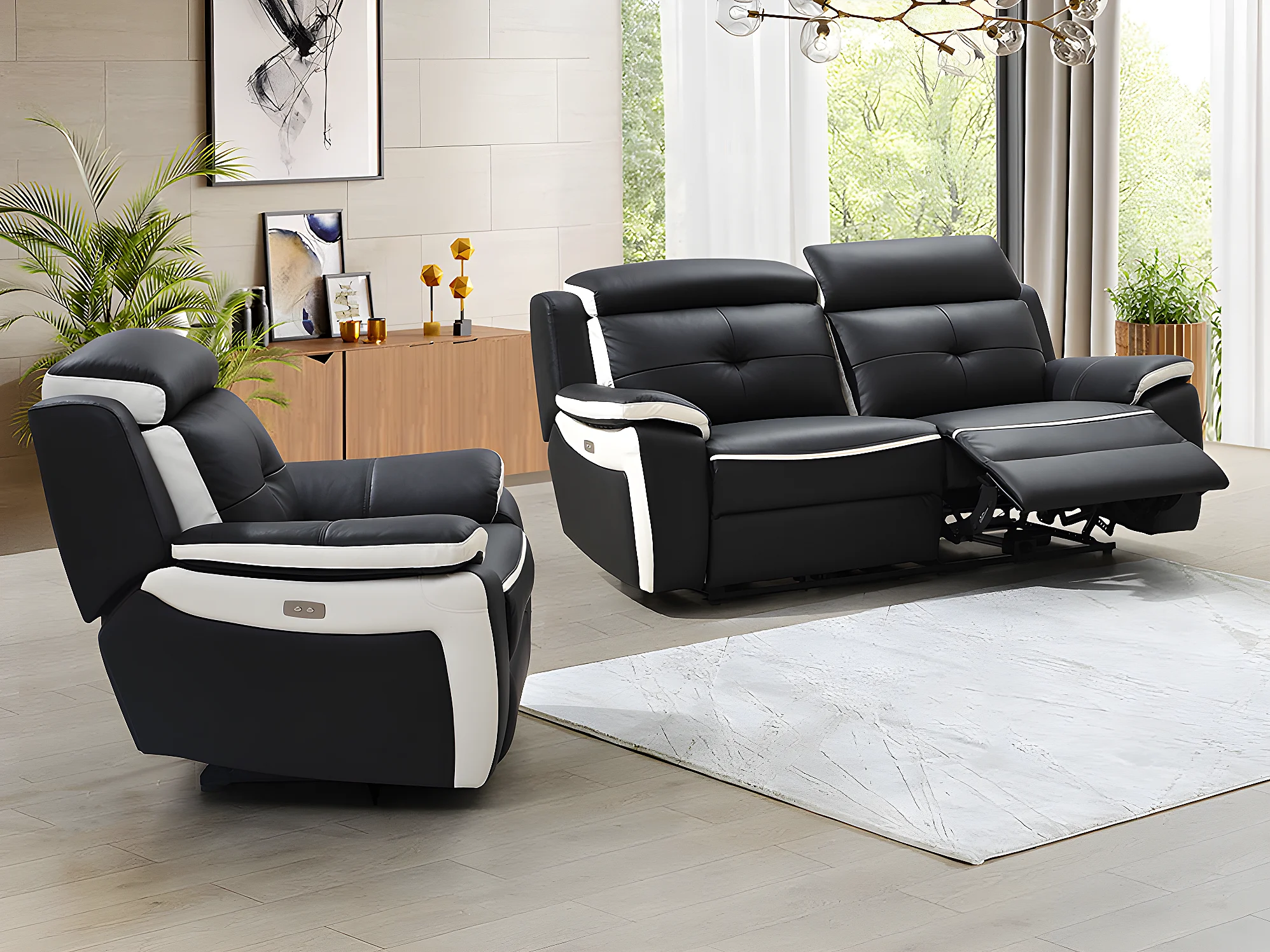 Elektrische driezits relaxbank en -fauteuil van leer ANGELIQUE - Zwart/wit