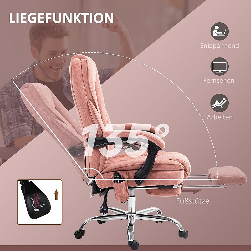 Ergonomische bureaustoel met massage en verwarming, verstelbaar, in hoogte verstelbaar, voetensteun, afstandsbediening, zijvak, roze