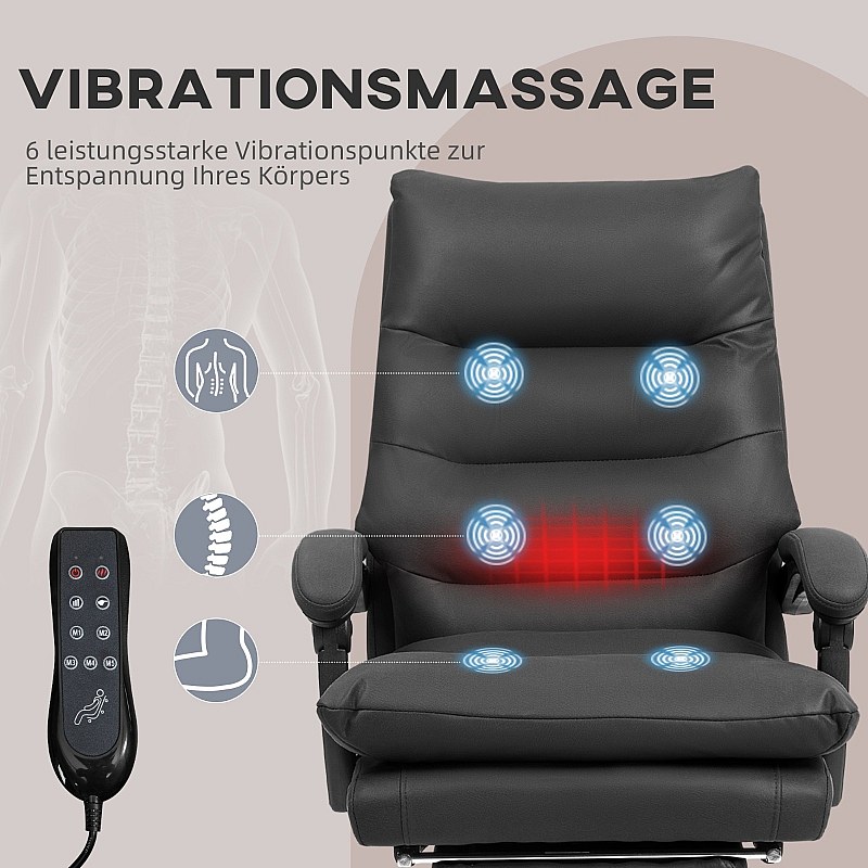 Ergonomische bureaustoel met massage, kantelfunctie en verwarming, in hoogte verstelbaar, voetensteun, draaibaar, zwart