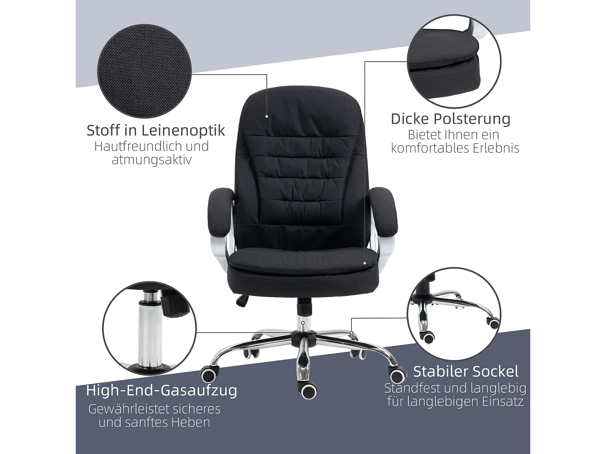 Ergonomische bureaustoel met verstelbare armleuningen, verstelbare rugleuning, linnen stof, zwart (64x75x111-121 cm)
