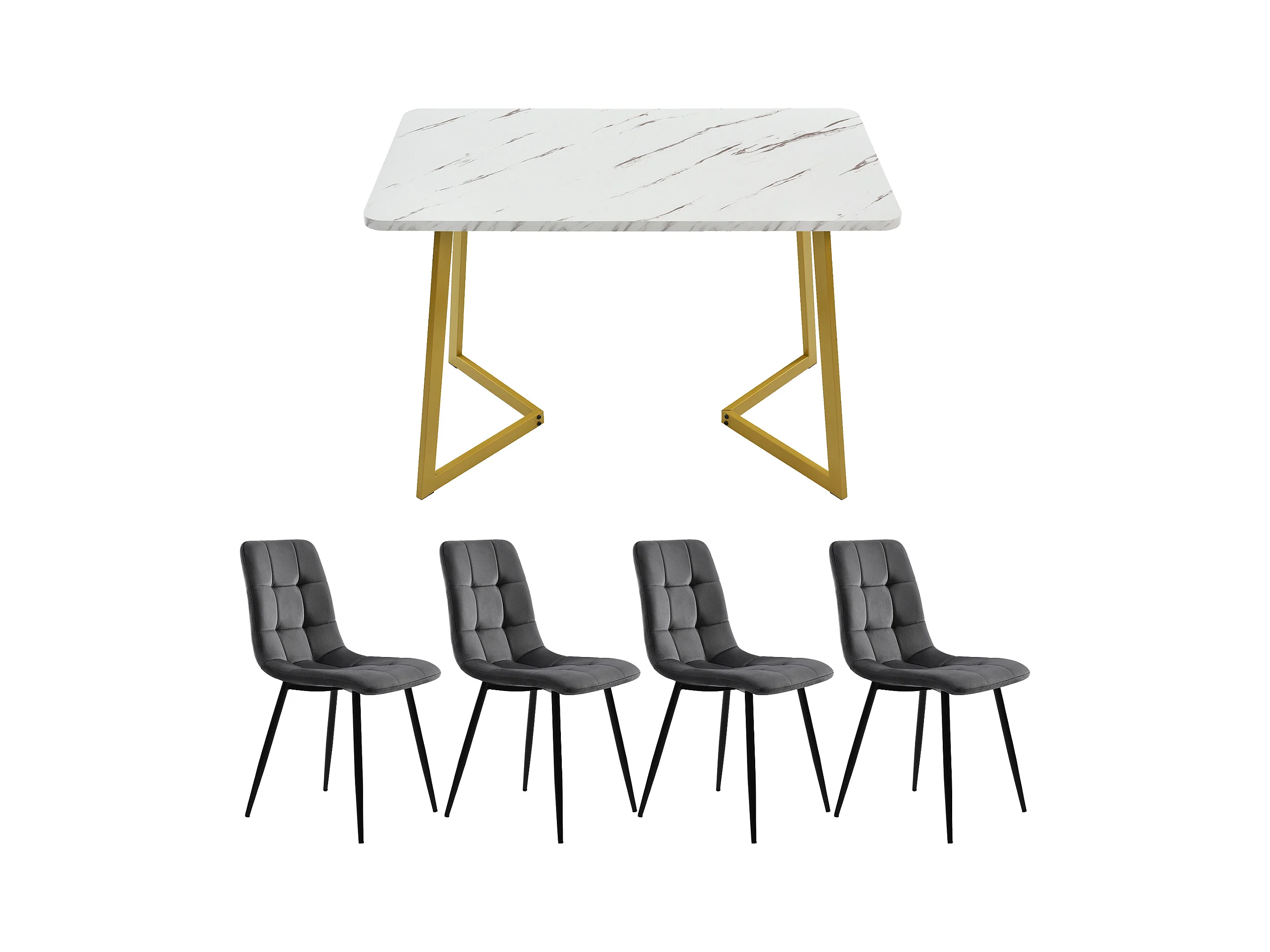 Essgruppe (5 stuks), Rechthoekige tafel 117x68 cm met 4 grijze fluwelen stoelen, gouden metalen poten, ruitmotief