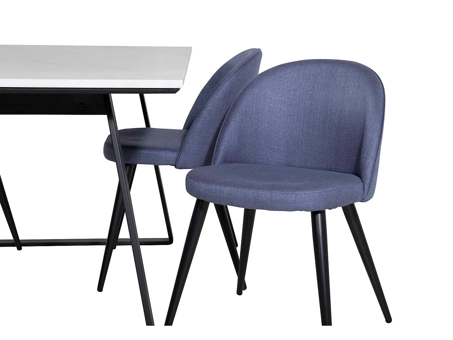 Estelle eethoek eetkamertafel marmer wit en 4 Velvet eetkamerstal blauw.
