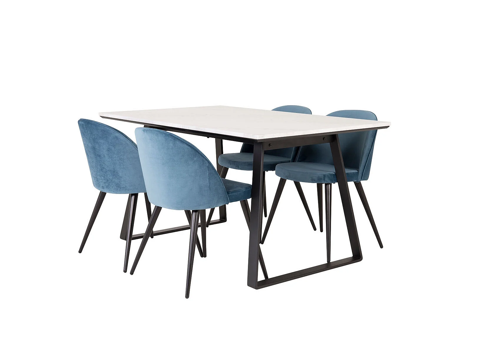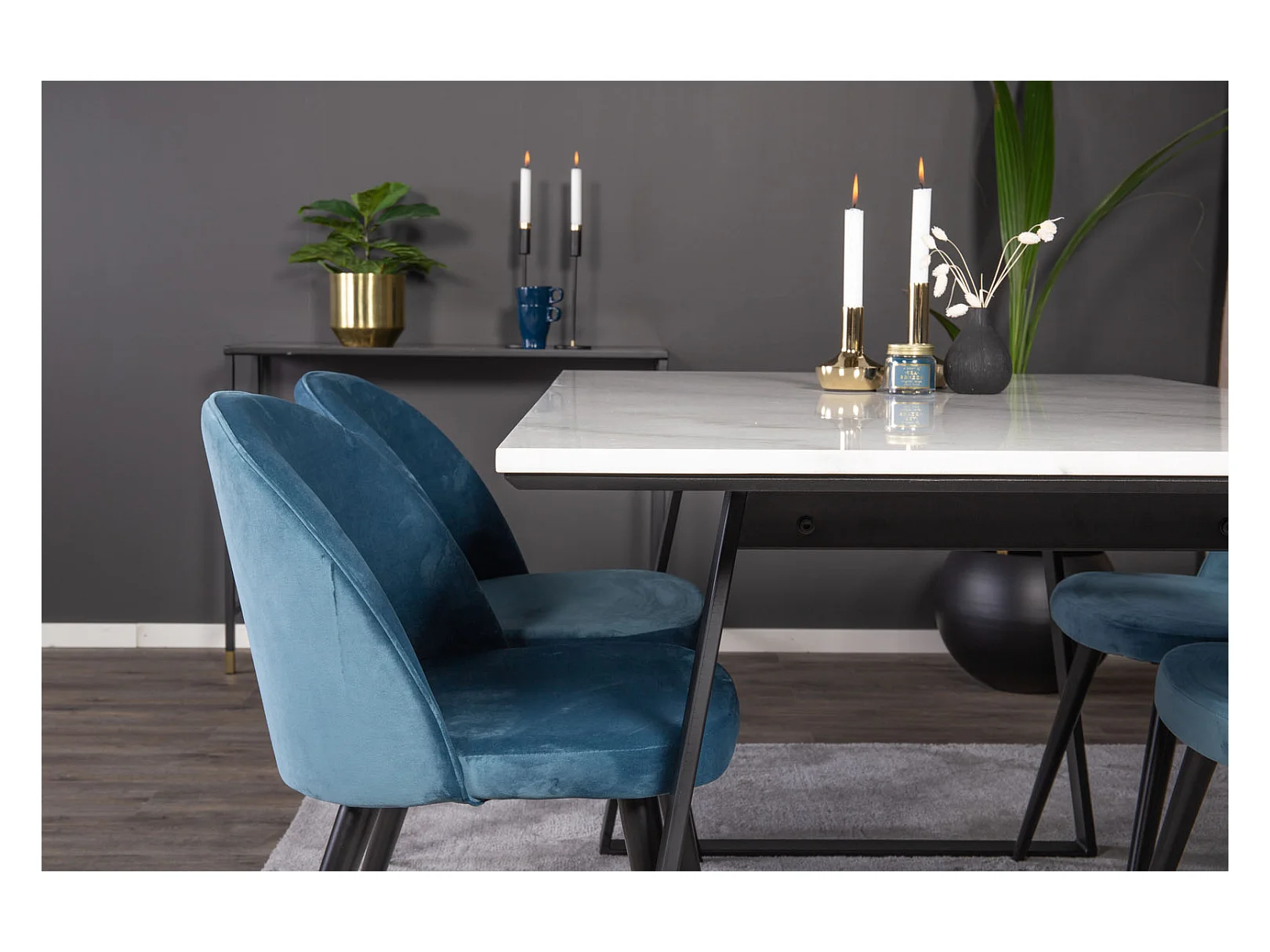 Estelle eethoek eetkamertafel marmer wit en 4 Velvet eetkamerstal velours blauw, zwart.