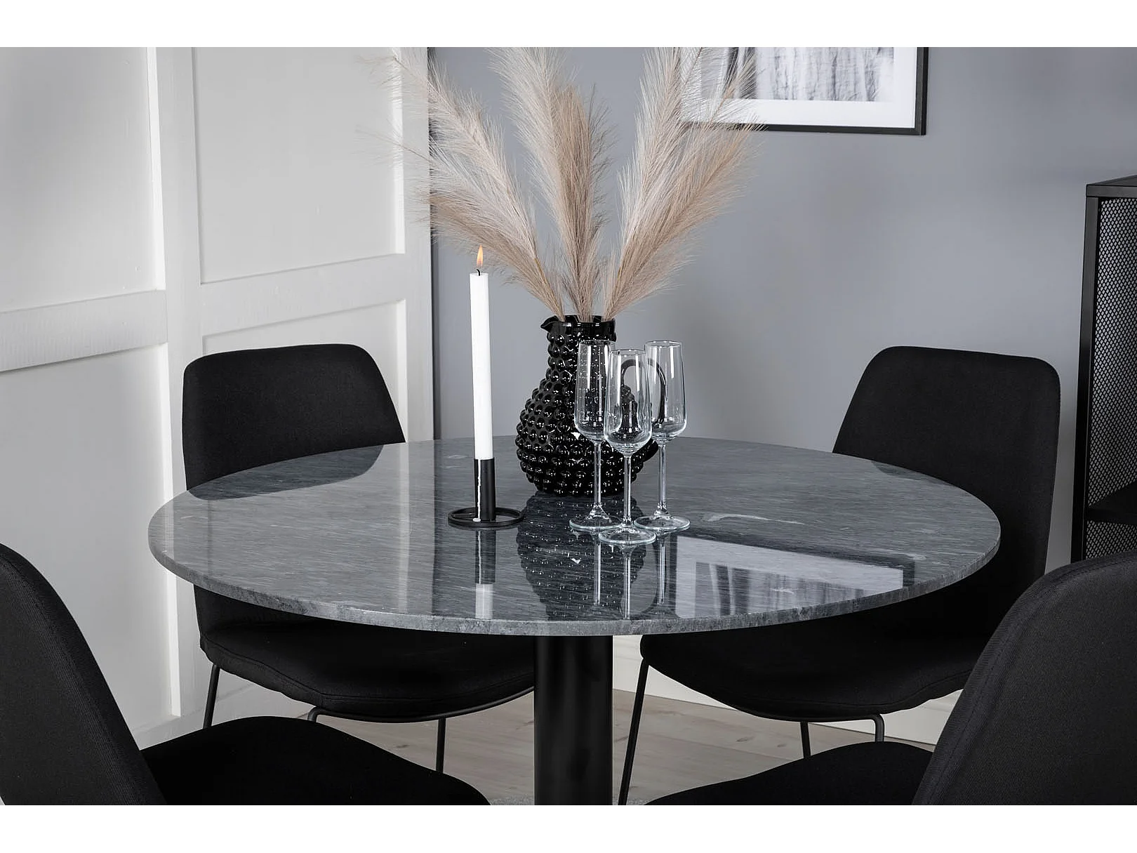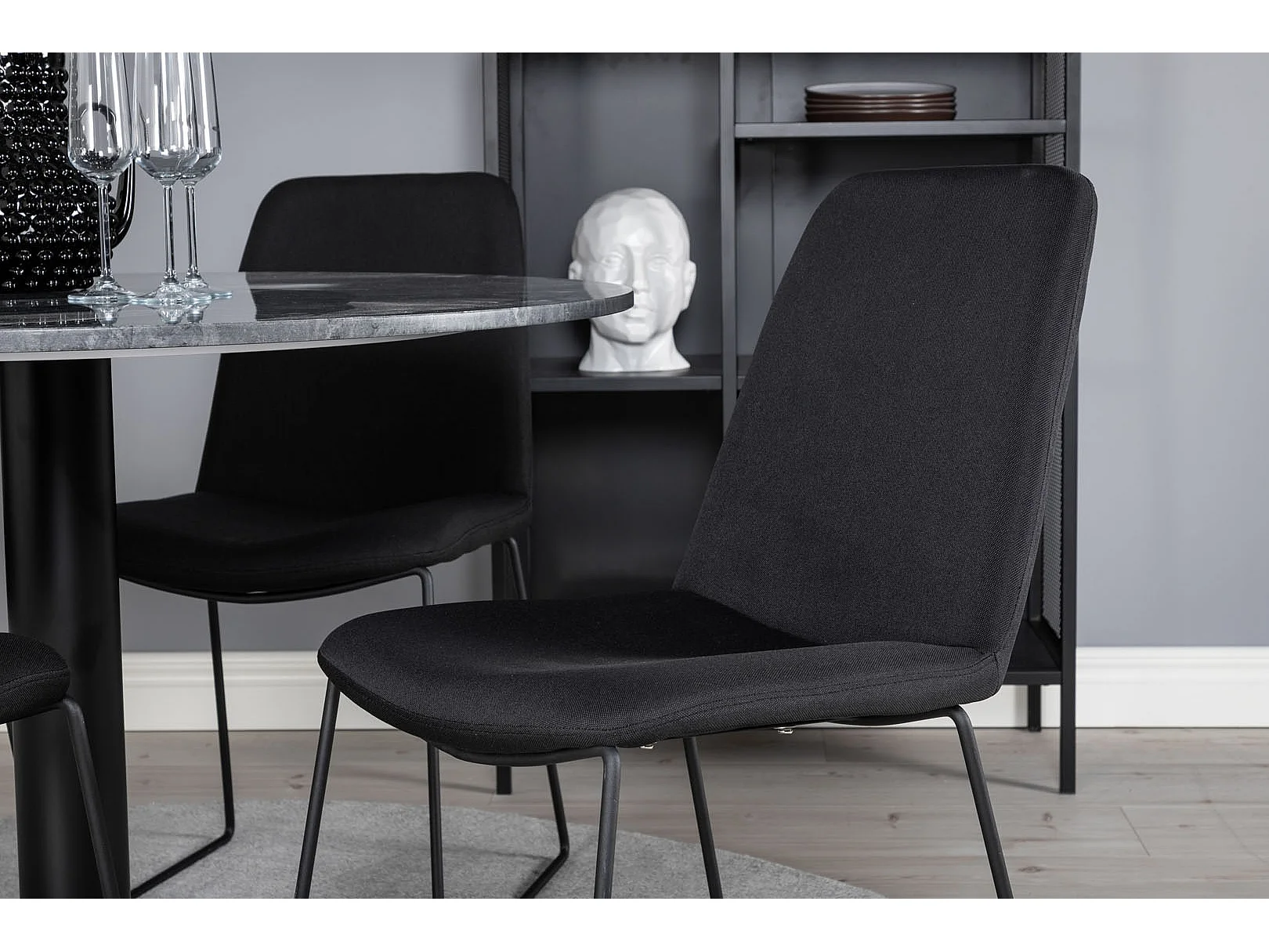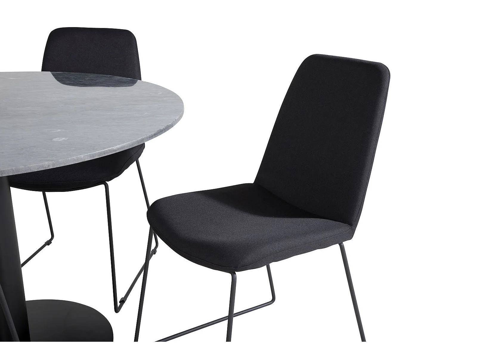 EstelleØ106BLBL eethoek eetkamertafel zwart, marmer en 4 Muce eetkamerstal zwart.