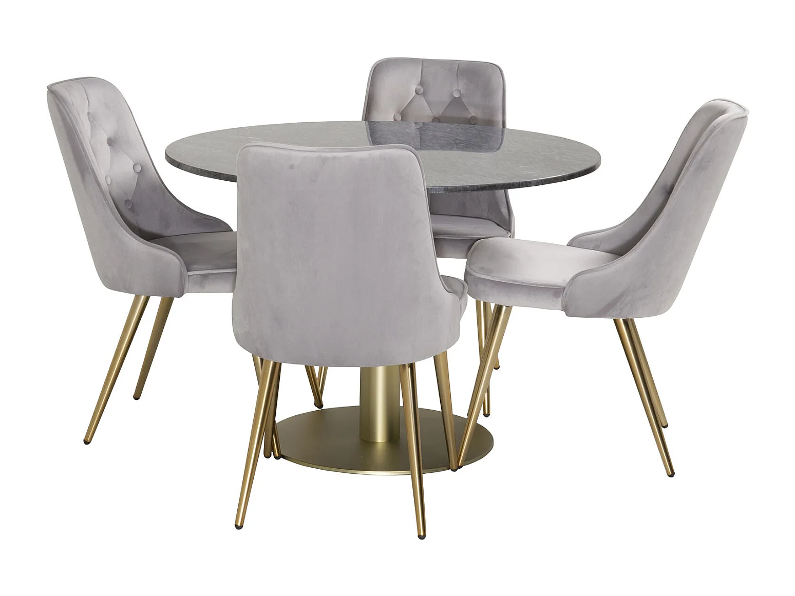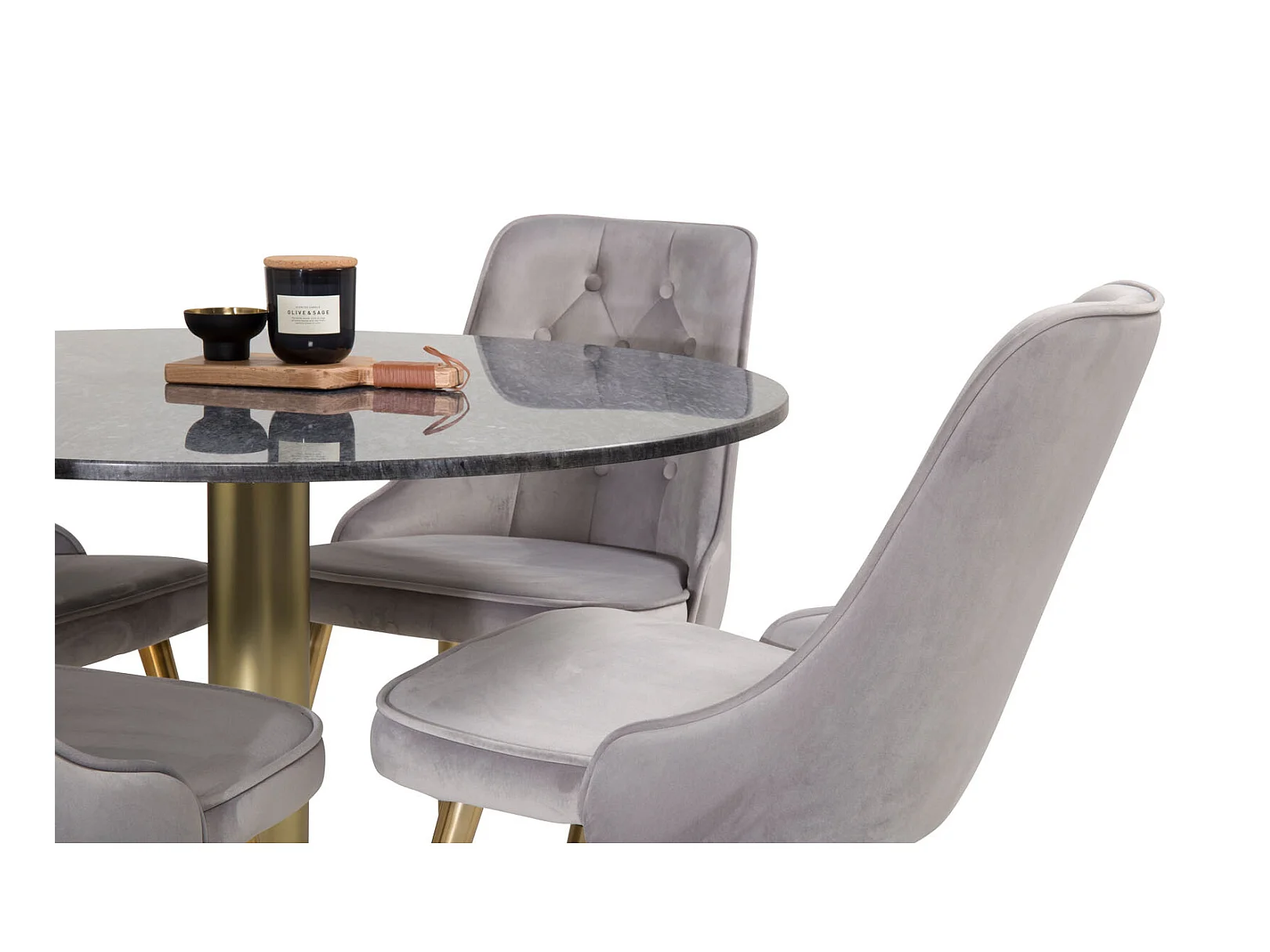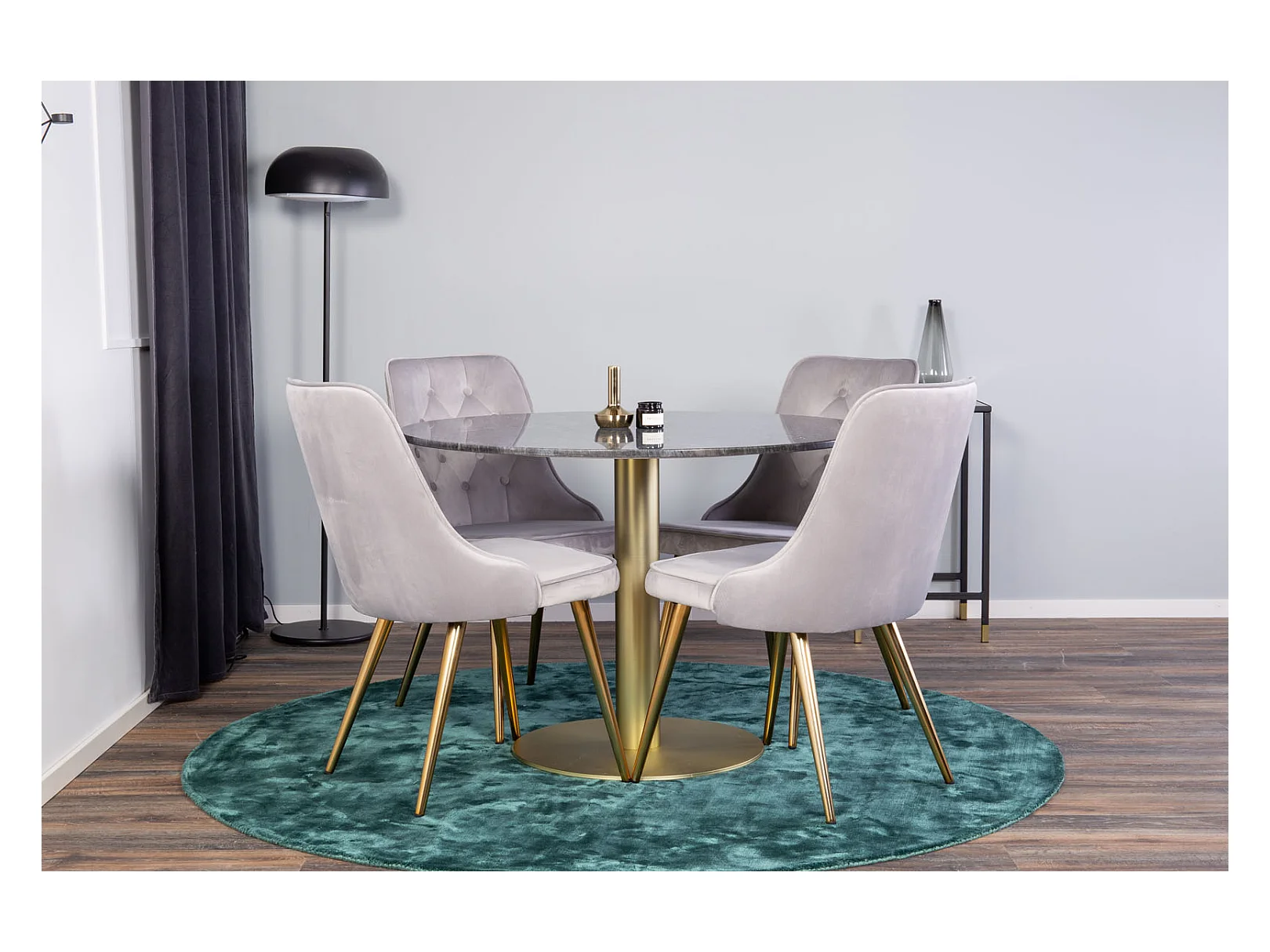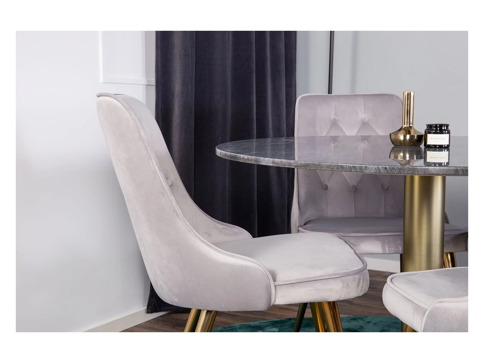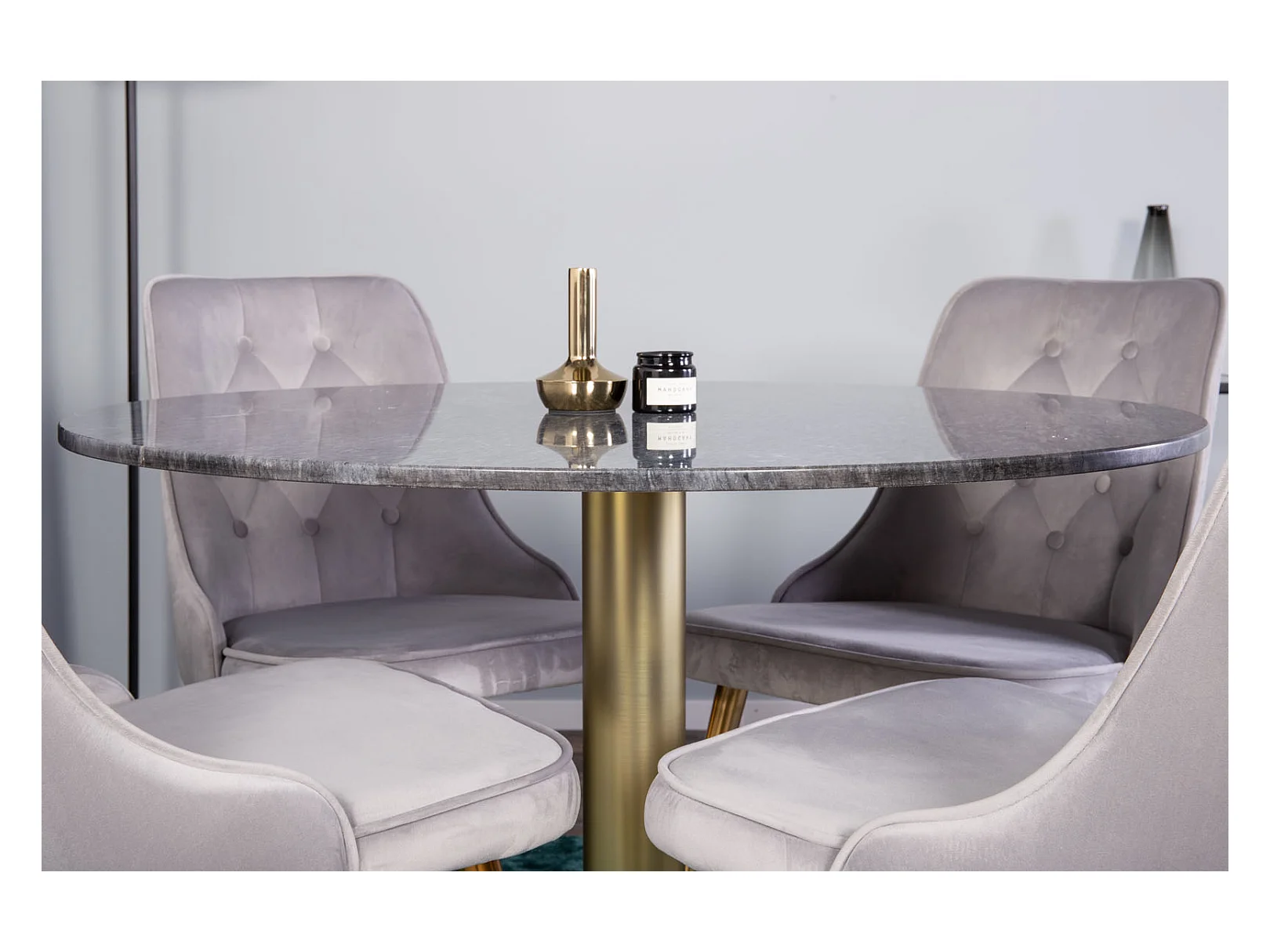 EstelleØ106BLBR eethoek eetkamertafel zwart, marmer en 4 Velvet Deluxe eetkamerstal velours lichtgrijs, messing decor.