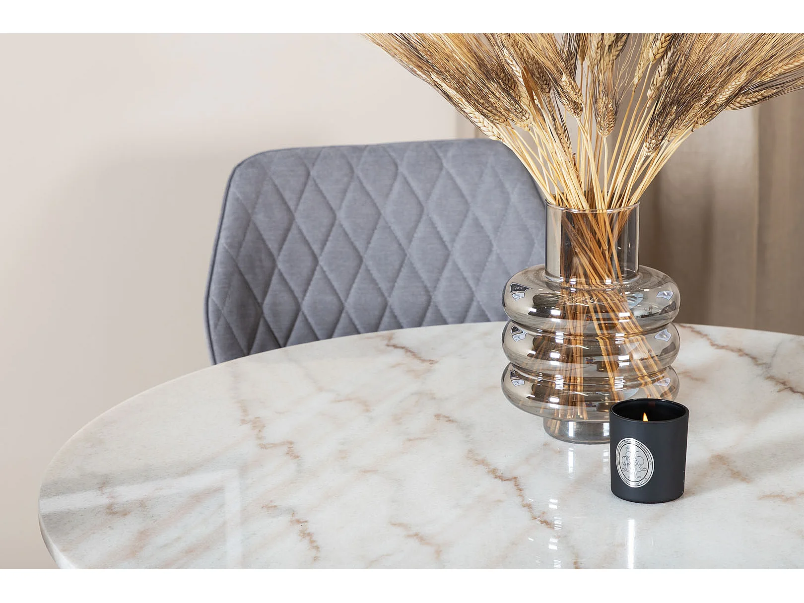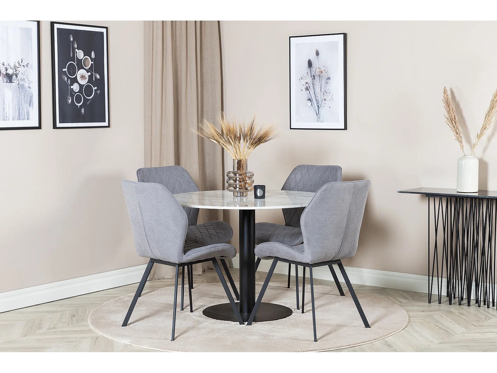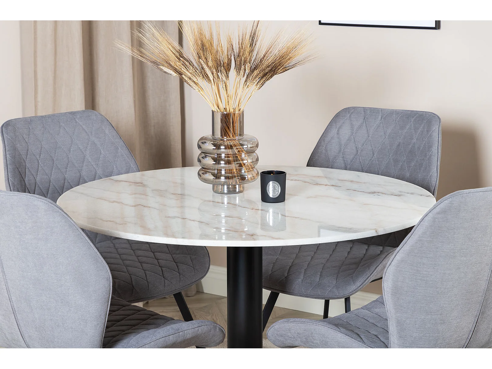EstelleØ106WHBL eethoek eetkamertafel wit, marmer en 4 Gemma eetkamerstal grijs.